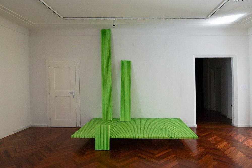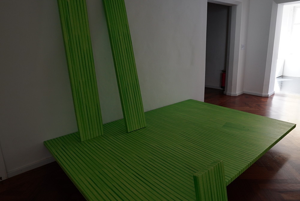 Raum und Zeit mit tätiger, immer gleicher, in markanten Strichen sich vollziehender Malarbeit zu verbinden, zeichnen die Arbeiten des 2014 verstorbenen Künstlers Ferdinand Penker aus. Aus seinem umfangreichen Nachlass haben wir für diese Ausstellung die vierteilige Arbeit Tatami ausgewählt, in der die Bedingungen der (malerischen) Bewegtheit mehrfach evident werden. Eine großflächige Leinwand scheint über dem Boden zu schweben, zwei schmale Leinwände lehnen an der Wand, und eine kleinere führt in Verbindung mit ihren Linienformen in einen Zustand der flüssigen Schwebe. Der Titel weist auf eine besonders in Japan verwendete, dämmende und dämpfende Matte aus Reisstroh, die auch als Schlafstätte dient. In Penkers Tatami legt sich eine grün leuchtende Leinwand als in fließenden Linien bemaltes Zeichensystem in den Raum hinein, an die Wand und, an sie angelehnt, weitere Leinwände. Sie machen aus ihm ein bewegtes Bezugsfeld, in dem der ganze Raum als System von fließenden Linien erkennbar wird. Hier findet sich Architektur als gefrorene, körperliche Bewegung wieder, ihr Stillstand ist nur einer des Moments. In seinen malerischen Kompositionen begleitet Penker die Zeit als Linie. Sie bildet sich darin ab und sie begleitet den Zeichnenden auf seinem Weg. Im Zeichen und im Zeichnen selbst hält er sie räumlich fest. Penker zeigt Raumzeit als Abhängigkeiten. Zeit ist das räumliche sich entspannende Muster von verstreichenden Entwicklungen und schafft dabei eine Meta-Zone des Dazwischen: hier sind Bewegung und Raum, die auf ihre ständige, implizite Veränderbarkeit verweisen, im Balanceakt zwischen Sein und gleichzeitigem Nicht-Sein gefangen.