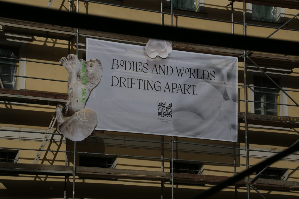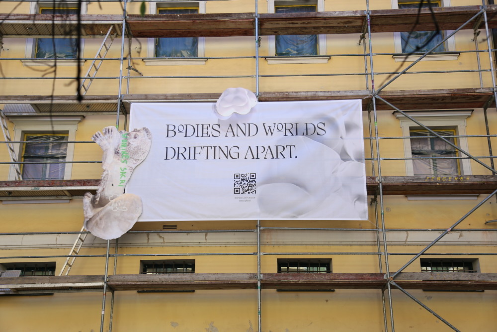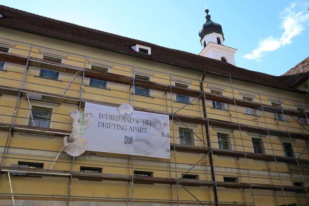 Im ersten Hof – dem Kreuzgang – ist das Gerüst für die Fassadenerneuerung sichtbar: Ein großes Baustellentransparent beschreibt eine Diagnose: „BODIES AND WORLDS DRIFTING APART – Körper und Welten driften auseinander“ ist dort als Beobachtung zu lesen. Der groß angebrachte QR-Code will gescannt werden. Dieser Schnappschuss führt weniger zu einem Imagefilm für das neue Veranstaltungszentrum, sondern in die andere Welt, die die Künstlerin Christiane Peschek anbietet: Passend zum Kreuzgang mit Paradiesbaum ist es EDEN, der virtuelle Paradiesgarten, in den man übers Smartphone eintauchen kann.