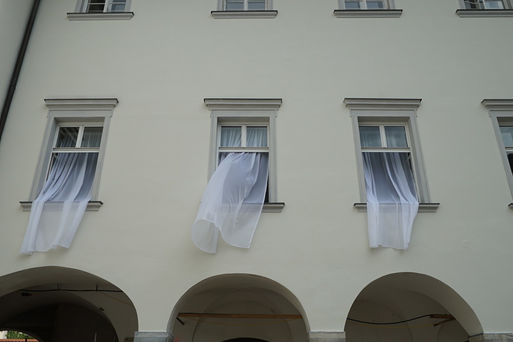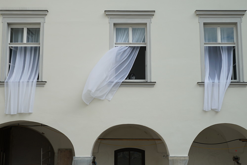 Der wie zufällig nach außen wehende Vorhang kündet den Aufbruchswind im Gebäude schon am Mariahilferplatz an. Das historische Klostergebäude, das sich in den letzten Monaten mancherorts erneuert und über die Jahre hinzugekommene Adaptionen und Zubauten abgeschüttelt hat, lässt am offenen Fenster auch Frischluft hinein. Zur Ausstellungseröffnung weht eine weitere Reihe von Vorhängen auch aus den Fenstern des zweiten bereits fertig sanierten Innenhofs und verortet auch hier ein Innen mit einem Außen.