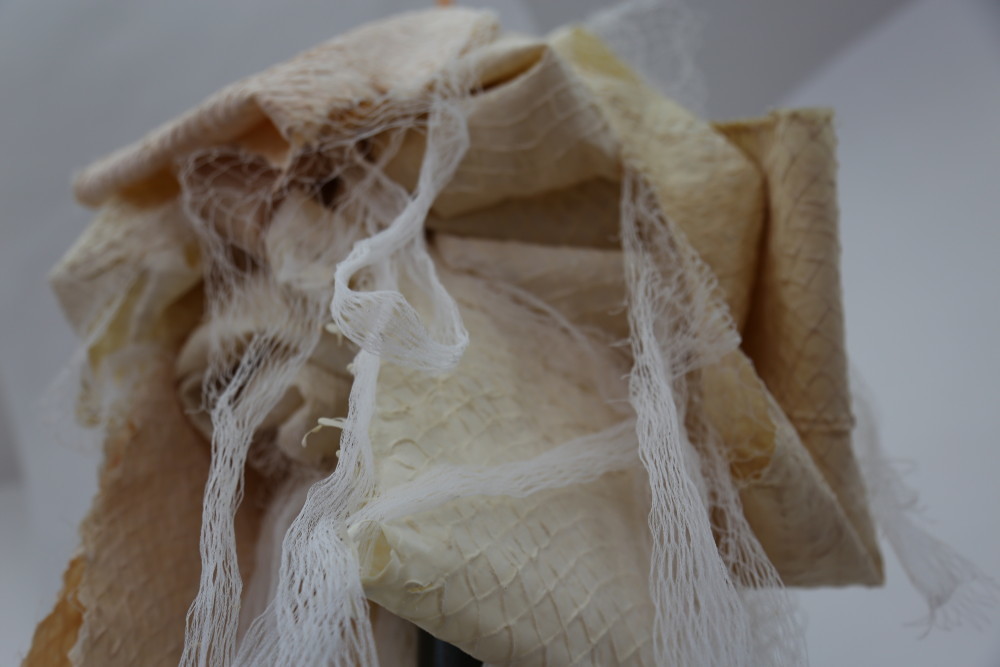 Sie erinnern an Körperzustände und Spiegelungen innerlicher physischer Bedingungen von Anziehung und Abstoßung, von Kontraktion und Extraktion. Not yet titled oder Transitions („Noch nicht gekippt”, „Übergänge”) führen in eine Zwischenwelt aus Entspannung und Bedrohung, aus lyrischer Verwendung von Sprache und physischem Übergriff. Was ein Blatt ist, könnte auch eine Schlangenhaut sein. Oder eine lange, überlange und schwere Zunge. Hängende Behältnisse erinnern an eingefallene Lungen. Puderweiche Oberflächen und die fühlbare Schwere der aufgehängten Latexmaterialien bewirken einen Spiegelreflex im Sinne von Lacan: Er lässt in die eigenen Eingeweide blicken. Irgendwo in dieser verführerischen Sinnlichkeit wird man als BetrachterIn seinen oder ihren Ort zu finden haben. Die Möglichkeiten des eigenen osmotischen Eintauchens oszillieren zwischen dem Angebot der Entspannung und des Niederlassens und den leisen Bedrohungen des fragilen Gegenübers beim tastenden Umwandern. Neben sinnlicher Verbundenheit bewirken die organischen Materialien auch einen Reflex des vorsichtigen Rückzugs. Im Angesicht von assoziativen Erinnerungen scheinen die Objekte mit ihren ausgestreckten Gliedern und langen Zungen wie fleischfressende Pflanzen zum leicht übergriffigen Verschlingen bereit.