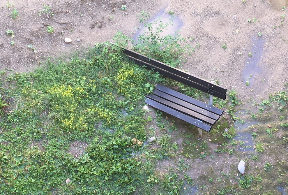 Vor dieser historischen Reminiszenz also diese sinkende Bank: Wilfings Spiel mit der Illusion schafft eine Form der Animation. Das Durchdringen der Erdoberfläche, lässt nicht nur grobe Schwankungen zu, sondern auch Durchlässigkeiten und Verbindungen, wo man sie nicht erwartet. Eine zweite Bank wird über die Projektlaufzeit im Hof Passanten zum Niederlassen einladen. Doch auch diese wirkt wie ein Akt der Täuschung. Entgegen des ersten Augenscheins bietet sie kein Schutzdach gegen Regen, Hagel oder Sonne, sondern besteht nur aus einem Metallgitter, das den Blick der Sitzenden – und nur vermeintlich Geschützten – direkt nach oben lenkt. Der Blick wird durch das Gitter zum fragmentierten und gerasterten Bild des Himmels, der Weite und Freiheit hinter Gittern nur mehr perforiert.