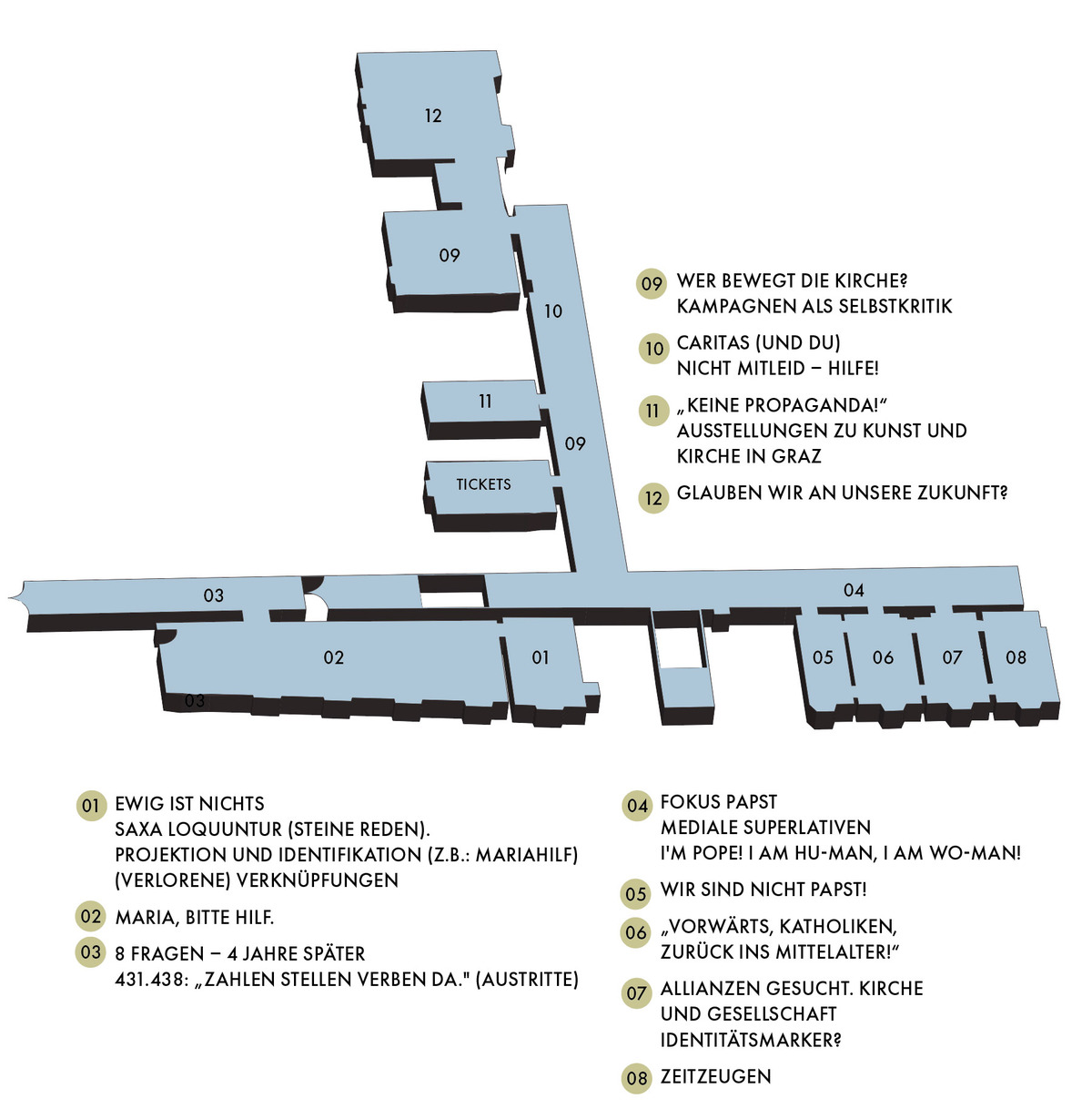 Soll sich Kirche in die Gesellschaft einbringen? Wie politisch darf und soll sie sein? Wie laut und wie leise? Die jüngere Geschichte der Katholischen Kirche in der Steiermark erzählt von einem breiten Dialog-Modell, nicht einfach von einer Trennung von Kirche und Staat. Dieses Modell ist allerdings nicht mehr selbstverständlich. Die ältere Geschichte weist freilich beträchtliche Hypotheken auf: die von Graz ausgehende Gegenreformation, die jahrhundertelange Allianz von Thron und Altar, der christliche Ständestaat und der Austrofaschismus auf der einen Seite, das Trauma des darauffolgenden Nazi-Regimes. Diese Erfahrungen führten zur offiziellen Emanzipation von politischen Parteien im „Mariazeller Manifest“ (1951), die eine „freie Kirche in einem freien Staat“ propagierte. Auf den Kartons: