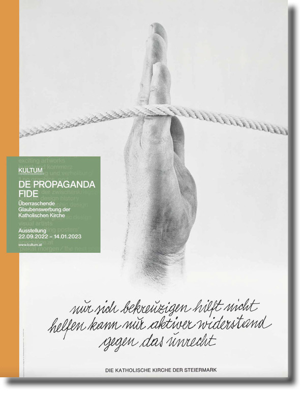 „Es darf keine Propaganda-Ausstellung werden!“ Das war die conditio sine qua non der damaligen Kunsthaus-Chefin Barbara Steiner (2016–2021), als (männliche) Vertreter der Diözese an das (weibliche) Team des Kunsthaus Graz mit der Idee vorgesprochen hatten, anlässlich des Jubiläums „800 Jahre Diözese Graz-Seckau“ eine zentrale Ausstellung im Grazer Kunsthaus machen zu wollen. Prinzipiell erschien alles nach diesem Erstgespräch möglich – mit Ausnahme der Propaganda eben. Dieser Gottseibeiuns wurde in der Folge konsequent ausgespart, einzig Taubstumme durften mit einer Bachkantate Jesus preisen. In der Ausstellung „Glaube Liebe Hoffnung“ im Kunsthaus Graz und im KULTUM wurde in 13 losen Assoziationsfeldern gezeigt, wie „zeitgenössische Kunst das Christentum reflektiert“. Im Prinzip traf dieses oben erwähnte Verdikt die über die Jahre gepflegte Form, zeitgenössische Kunst und Kirche in ein produktives Verhältnis zu setzen, die in vielen Ausstellungen im Kulturzentrum bei den Minoriten realisiert worden sind. Den Anfang dieser konsequenten Ausstellungspolitik setzte die Ausstellung „entgegen. ReligionGedächtnisKörper in Gegenwartskunst“ im Jahre 1997, als die II. Europäische Ökumenische Versammlung in Graz unter dem Thema „Versöhnung. Gabe Gottes – Quelle neuen Lebens“ abgehalten wurde. Versöhnt fand man damals jedenfalls die beiden Pole Kunst und Religion nicht, deshalb ein durchgestrichenes „entgegen“ (Gestaltung: Christian Bretter). Doch Anish Kapoor, der damals in der Katharinenkirche beim Grazer Mausoleum Kaiser Ferdinands II. seine „goldene Hohlkugel“ zeigte, reagierte in einem Interview auf den Titel mit den Worten: „Die wahren Probleme sind Schönheit, Stille und vielleicht der Tod. Für oder entgegen ist vollkommen irrelevant in diesem Zusammenhang.“ Plakat zur Ausstellung „Glaube Liebe Hoffnung“, anlässlich 800 Jahre Diözese Graz-Seckau, 2018, Kunsthaus Graz und KULTUM