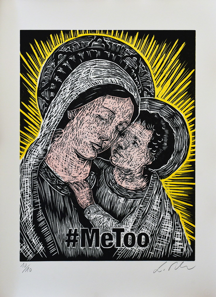 In unmittelbarer Nachbarschaft zu den Caritas-Plakaten ist für diese Ausstellung ein „Fresko“ aufgedeckt, das seit zehn Jahren verschlossen ist: In ihrer Serie der „Icons“ hat die in New York lebende Künstlerin Ewa Harabasz, die aus der Stadt Czestochowa (Tschenstochau) mit dem polnischen Nationalheiligtum der „Schwarzen Madonna“ stammt, mediale Bilder aus den Tagesnachrichten der Kriegs- und Dokumentarfotografie in der Tradition der orthodoxen Ikonenmalerei überformt. Bei der hier gezeigten „Ikone“, die Harabasz in der Ausstellung „Mutter“ (2010) als permanente Arbeit im KULTUM anfertigte, rettet eine Frau ein Kind in einem Geiseldrama in Beslan. Zwar ist der Goldgrund professionell grundiert, doch das Gold ist Schlaggold, und die „Malerei“ ist ein Abziehbild, das einer Zeitung entnommen ist. Der zufällige fotografische Schuss macht die Frau, die dieses Kind rettet, ungewollt zur Madonna – für die Aufmerksamkeit eines Zeitungstages. Nach Giorgio Agamben ist der homo sacer die Figur des vollkommen Schutzlosen, der auf seine bloße physische Existenz, sein „nacktes Leben“ reduziert ist. Mit der künstlerischen Sakralisierung der Rechtlosen rückt die Künstlerin ein ausgegrenztes Leben in den Glorienschein unserer Aufmerksamkeit und damit in das Blickfeld unseres Handlungsspielraums. Ewa Harabasz, Ohne Titel, 2010