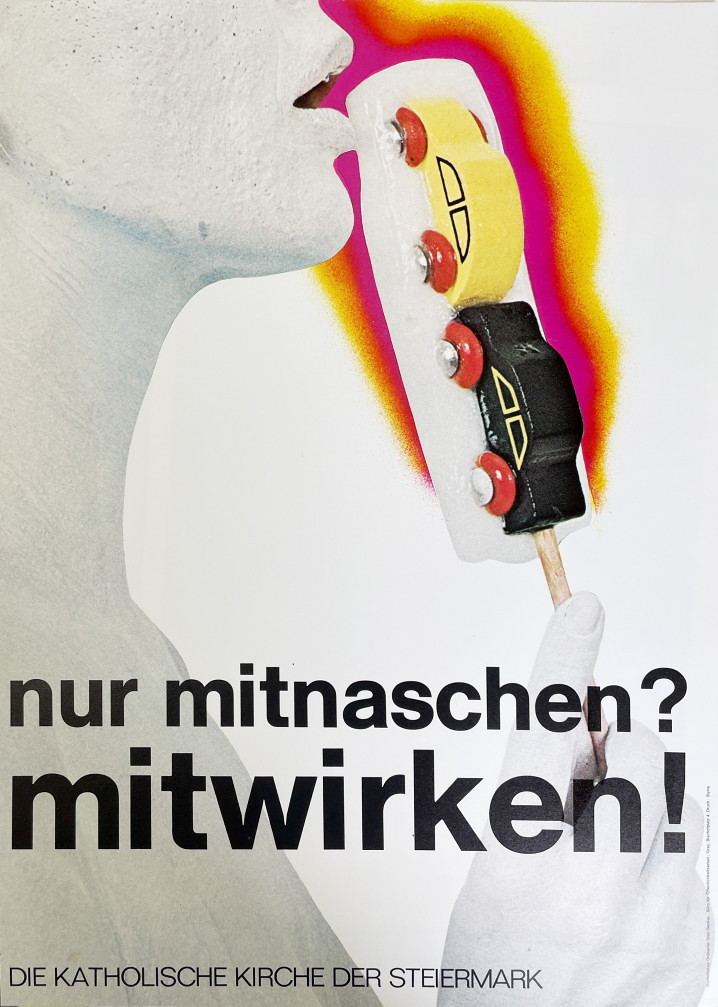 Ein Kirchturm mit seiner Uhr als Waschmaschine – „DAS MEINEN WIR NICHT!“, ein Wohlfühlpolster für Wohnzimmer – „KOMM GUT HEIM! (Aber wozu?)“ – ein WERGWERFMENSCH, ein Sprungtuch mit der Aufschrift: „SPRING!“ und der Satz „Nur sich bekreuzigen hilft nicht, helfen kann nur aktiver Widerstand gegen das Unrecht“: Der Auftritt, der ersten Imagekampagne der „Katholischen Kirche der Steiermark“ nach dem II. Vatikanischen Konzil war außergewöhnlich. Den Auftrag dazu hatte (oder holte sich) der Theologe und Kirchenmusiker Johann Trummer (1940–2019). Im Rückblick gesehen ist diese Form der Kampagne, die „auftraggebende Institution mit ihrer eigenen Botschaft zu kritisieren, einzigartig“ (H. Baloch). Die Botschaften waren allesamt hintergründig und trafen vor allem die Kirche selbst: Am stärksten ist der „fasten“-Appell: Aufgeblasene Luftballons, ein berühmter Marken-Gürtel von damals, der Schriftzug „fasten“ ist wohl nicht nur als Kampagne für die Fastenzeit zu verstehen. Die semantische bzw. semiotische Verknüpfung suggeriert eher auch ein Platzen, nicht nur eine Schlankheitskur. Oder ein Anschnallen („fasten your seatbelts“) im Falle des leichten Entschwebens. Schließlich stand die Frage im Raum: „Ist Christus ein Seelenspray?“ (das Cover für eine Kirchweihe im Seelsorgezentrum Niklasdorf 1971). Oder, noch mutiger: „Wer hat aus ihm eine Konservendose gemacht?“ Statt des Corpus war eben die Konserve angenagelt. Dieses Plakat, das in Graz auch ausgeschieden war, wurde 1200 mal für die Katholische Hochschulgemeinde in Leoben reproduziert und auf Initiative des damaligen Hochschulseelsorgers Heinrich Schnuderl im Studienjahr 1972/73 an die Studierenden verteilt: Es war wahrlich ein Diskursöffner ... In den Leuchtkästen