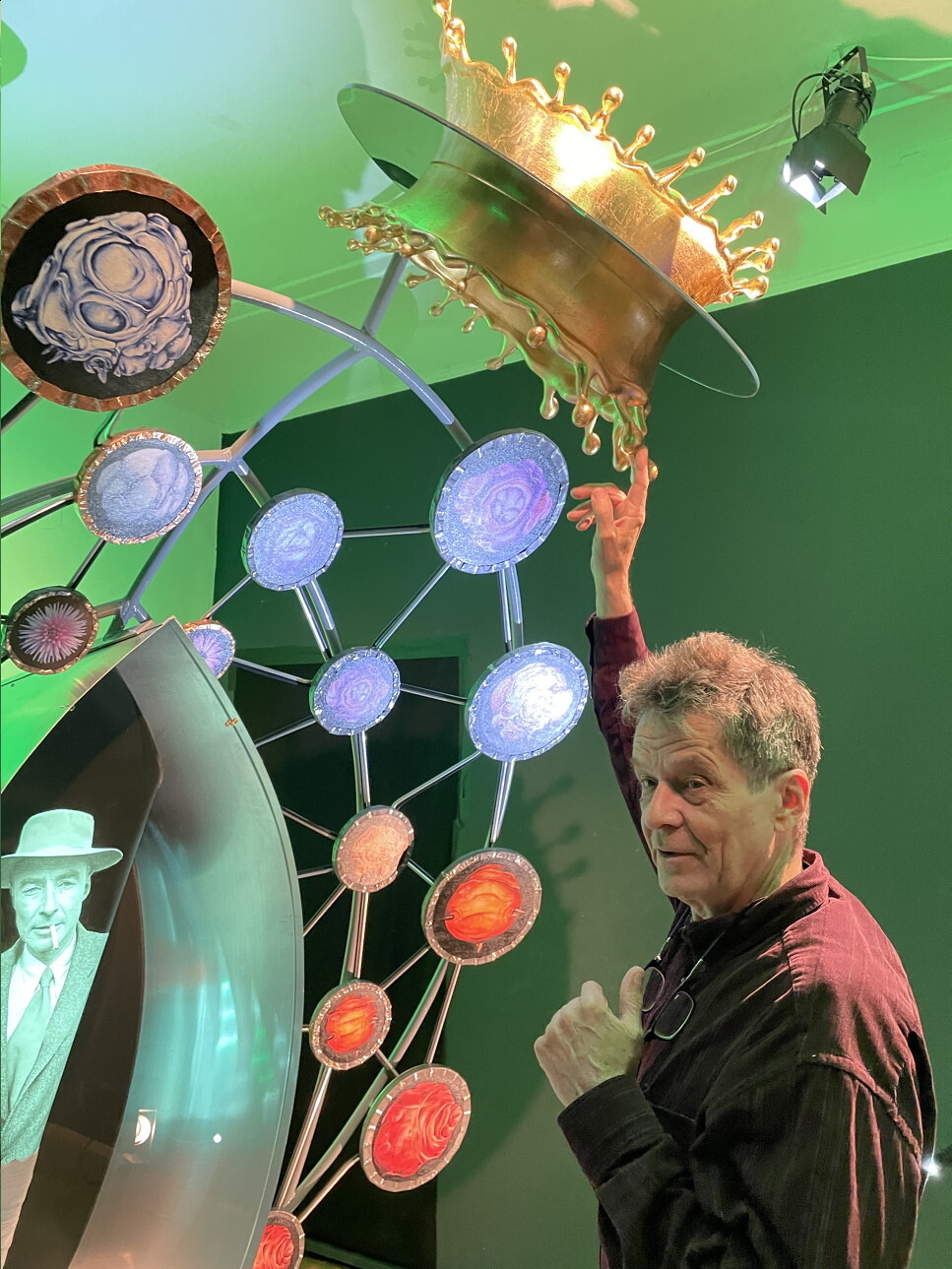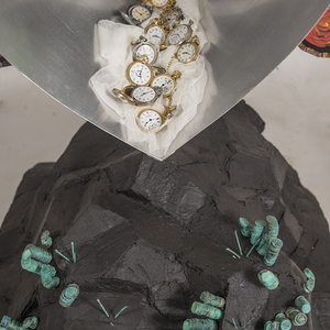 Henry Jesionka: Trinity –  ein Grabmal für J. Robert Oppenheimer, 2023, 2,7 m x  x 2,2 m  x 1,9 m, Acryl auf Leinwand, Aluminium, Kupfer, Blei, Bandagen, Taschenuhren, Blattgold auf Kunststoff (Krone), Beton, oxidierte Kupferpfennige, Duratran, Leuch
