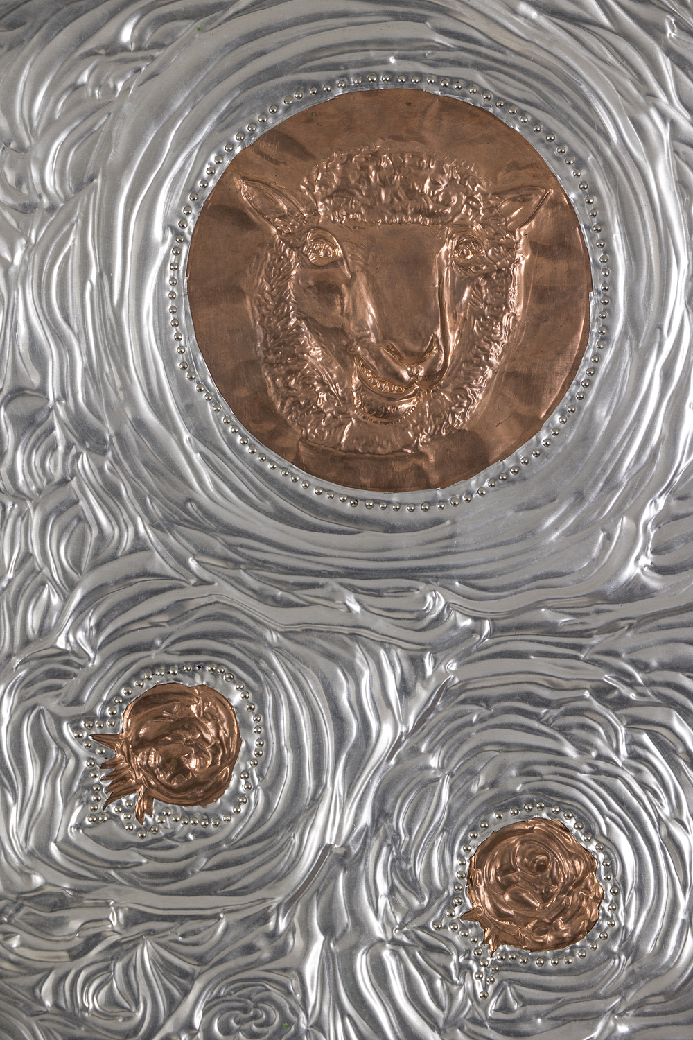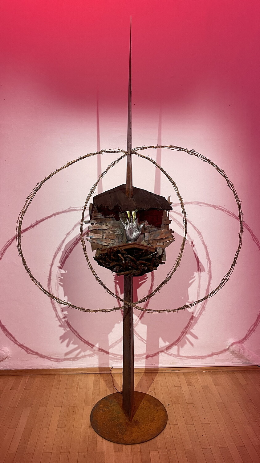 Die Skulptur besteht aus zwei mittig angeordneten Händen, die Rücken an Rücken platziert sind - eine aus Aluminium gegossen, aber so bearbeitet, dass sie wie Blei aussieht, und die andere aus Messing gegossen, aber so bearbeitet, dass sie wie Gold aussieht - und in Augenhöhe zwischen zwei sich kreuzenden Stacheldrahtscheiben platziert sind (was wiederum an die “vesicapiscis” erinnert).