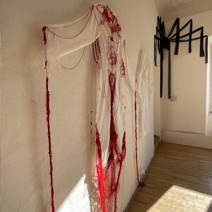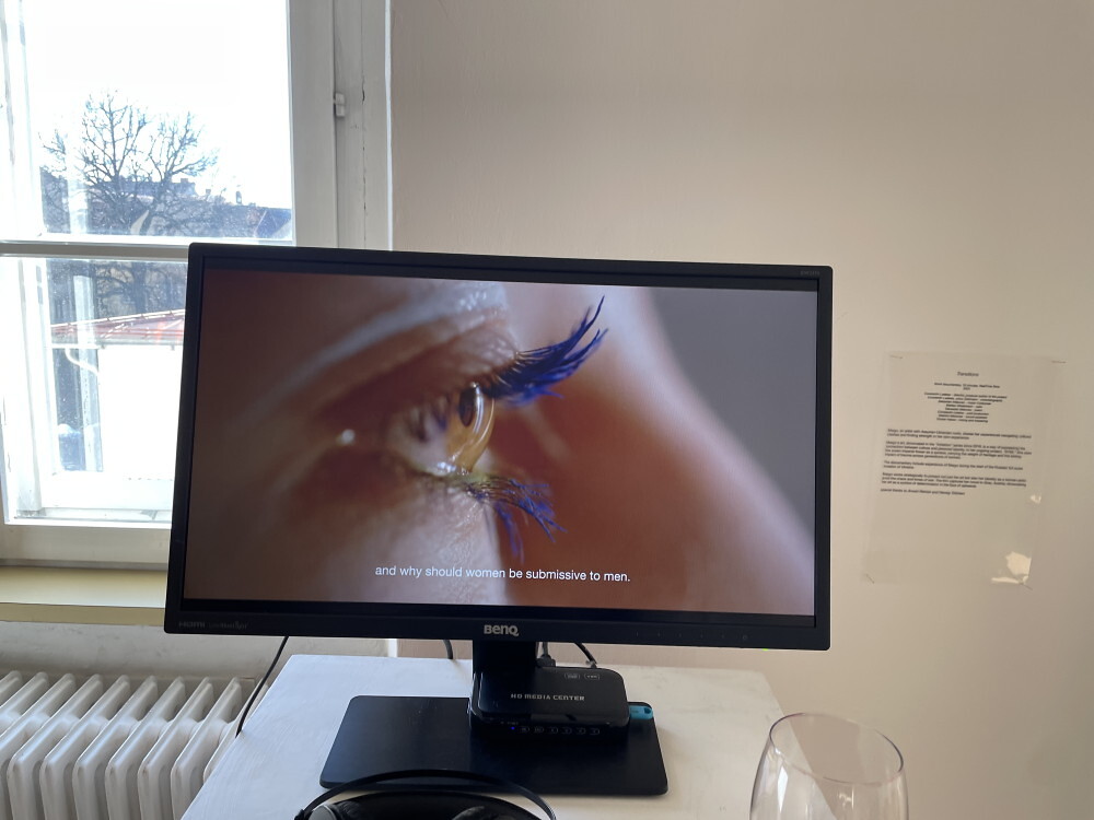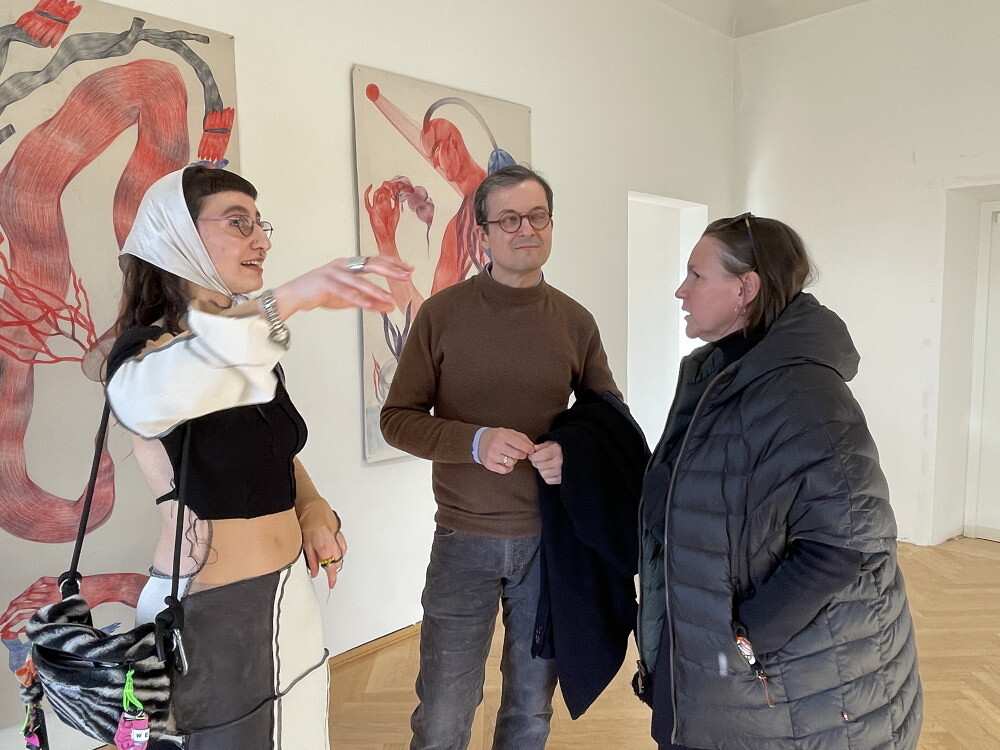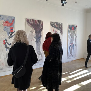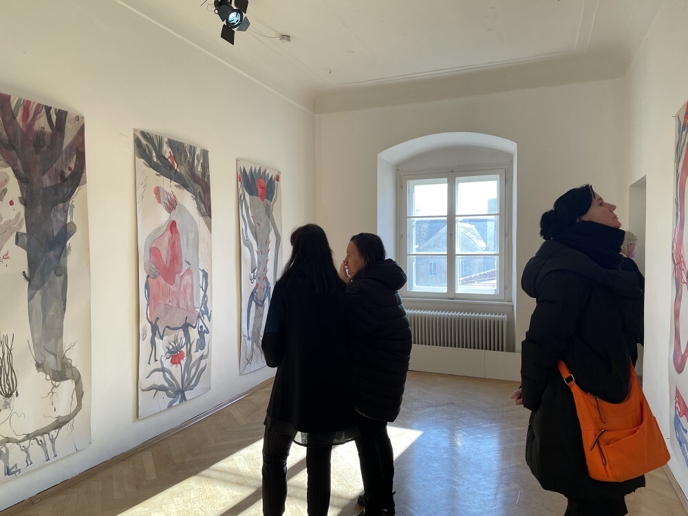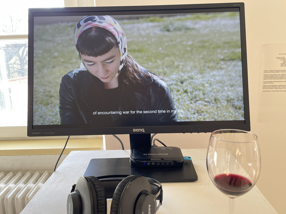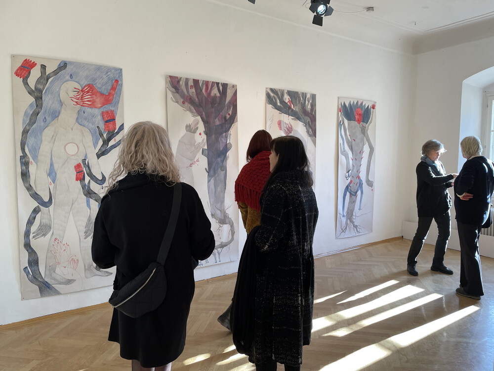 Die junge ukrainische Künstlerin Margo Sarkisova musste wegen dem Krieg der Russen gegen die Ukraine bereits zwei Mal fliehen: 2014 von Donezk nach Charkiv und 2022 von Charkiv nach Graz. Sie zeigt in der Ausstellung ihr künstlerisches Forschungsprojekt „6769“, das ihre doppelte Herkunft als Ukrainerin und assyrische Christin thematisiert. Wie lässt sich dabei das Konzept von Individualität mit ihrer Herkunft vereinbaren? Wie sieht die geschlechtsspezifische Sozialisierung von Frauen aus? Viele ihrer Bilder weisen Symbole wie Wurzeln und Blumen auf: Ein Beispiel, die auf die Bewältigung der Fluchterfahrung der Künstlerin anspielt: Die Figur des Gärtners, die sie in ihren Werken untersucht, wird als Bild des zukünftigen „friedlichen Soldaten“ gezeigt, der nie aufhört, metaphorische Samen für die Zukunft zu pflanzen.
