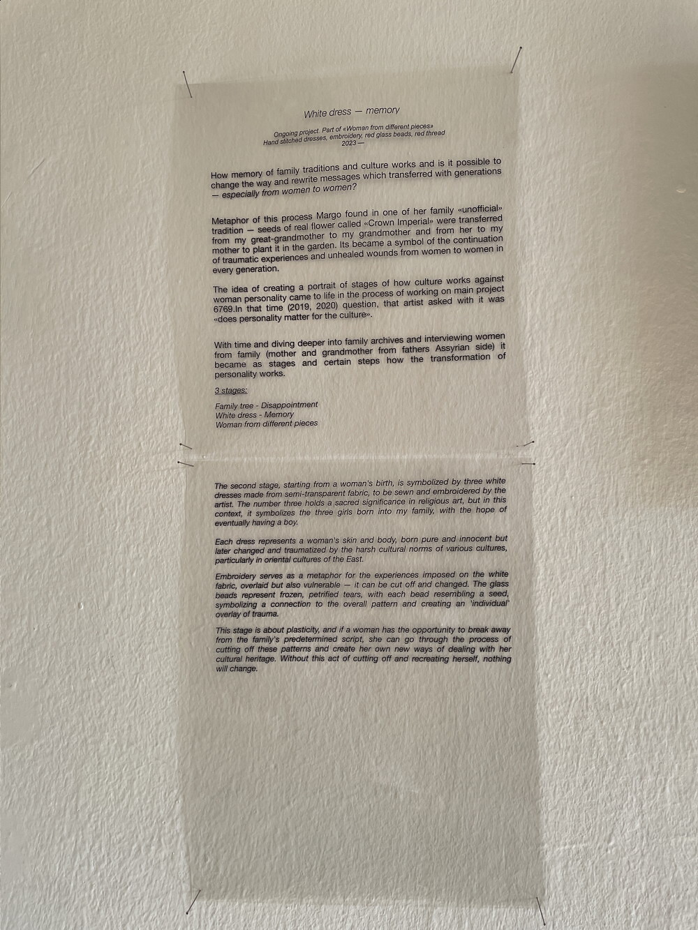 Teilnahme an internationaler Gruppenausstellung im Print Center New York (USA) 2020 und Projektmitarbeit bei „Falling Shadow of Dreams“ im ukrainischen Pavillon auf der 58. Biennale von Venedig (2019). In ihrer künstlerischen Praxis erforscht die in ihrer Familie sowohl die assyrische und ukrainische Identität vereinende Künstlerin nationale Identität, Ungleichheit zwischen den Geschlechtern sowie die Rolle der Frau und arbeitet über „Heimat“, „Wurzeln“ und den Impact des kulturellen Kontexts auf das Leben der Menschen.