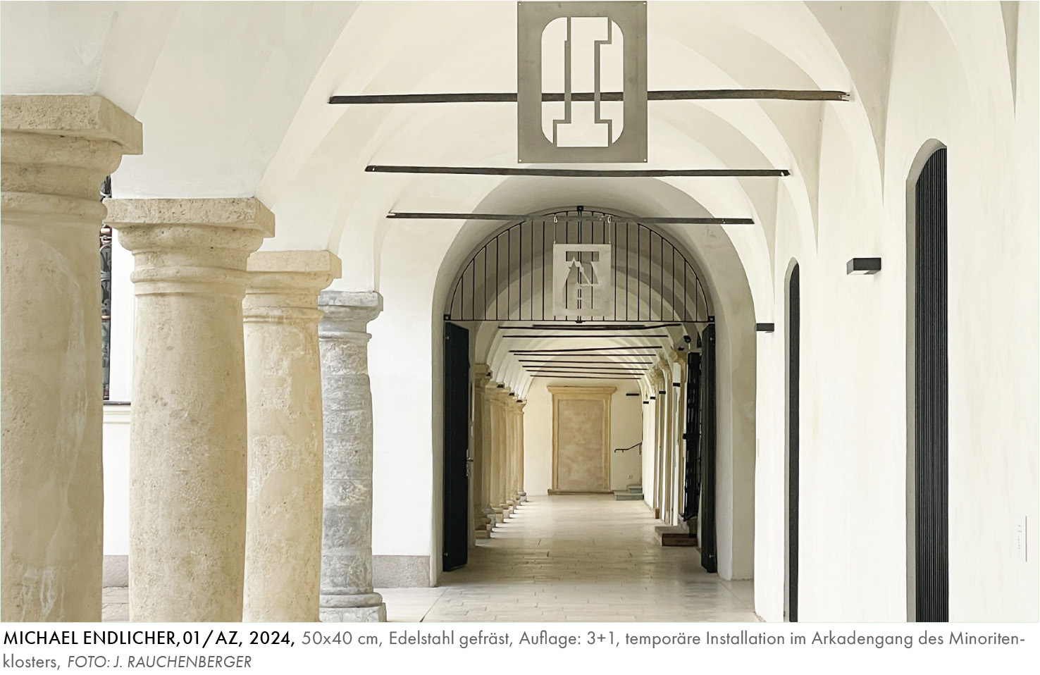 Michael Endlicher stellt in seiner Kunst allgemeine Fragen. Sie sind existenzieller Natur, ebenso aber gesellschaftlicher und politischer. Um ganz von vorne noch einmal anzufangen: Eine Brise eines Windzugs im Arkadengang im Hof vor dem Minoritensaal lässt die beiden gefrästen Metalltafeln mit ihren ausgeschnittenem „01“ und „AZ“ höchst lebendig werden.
