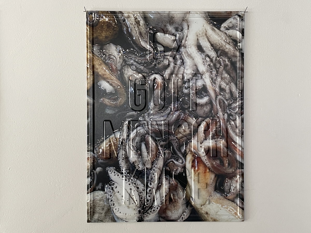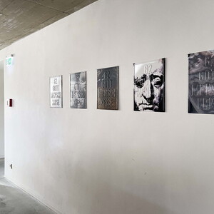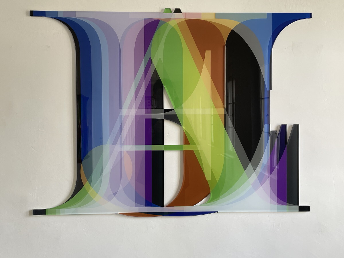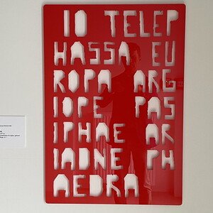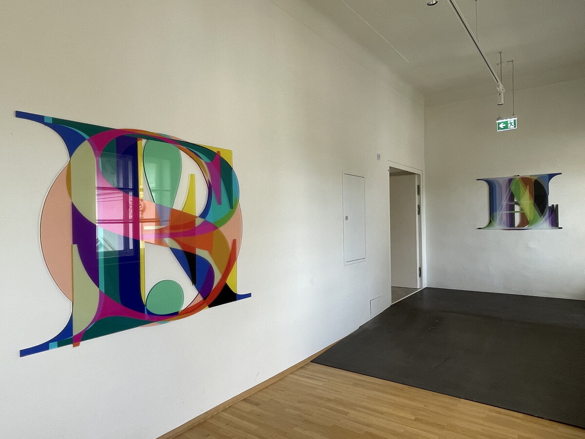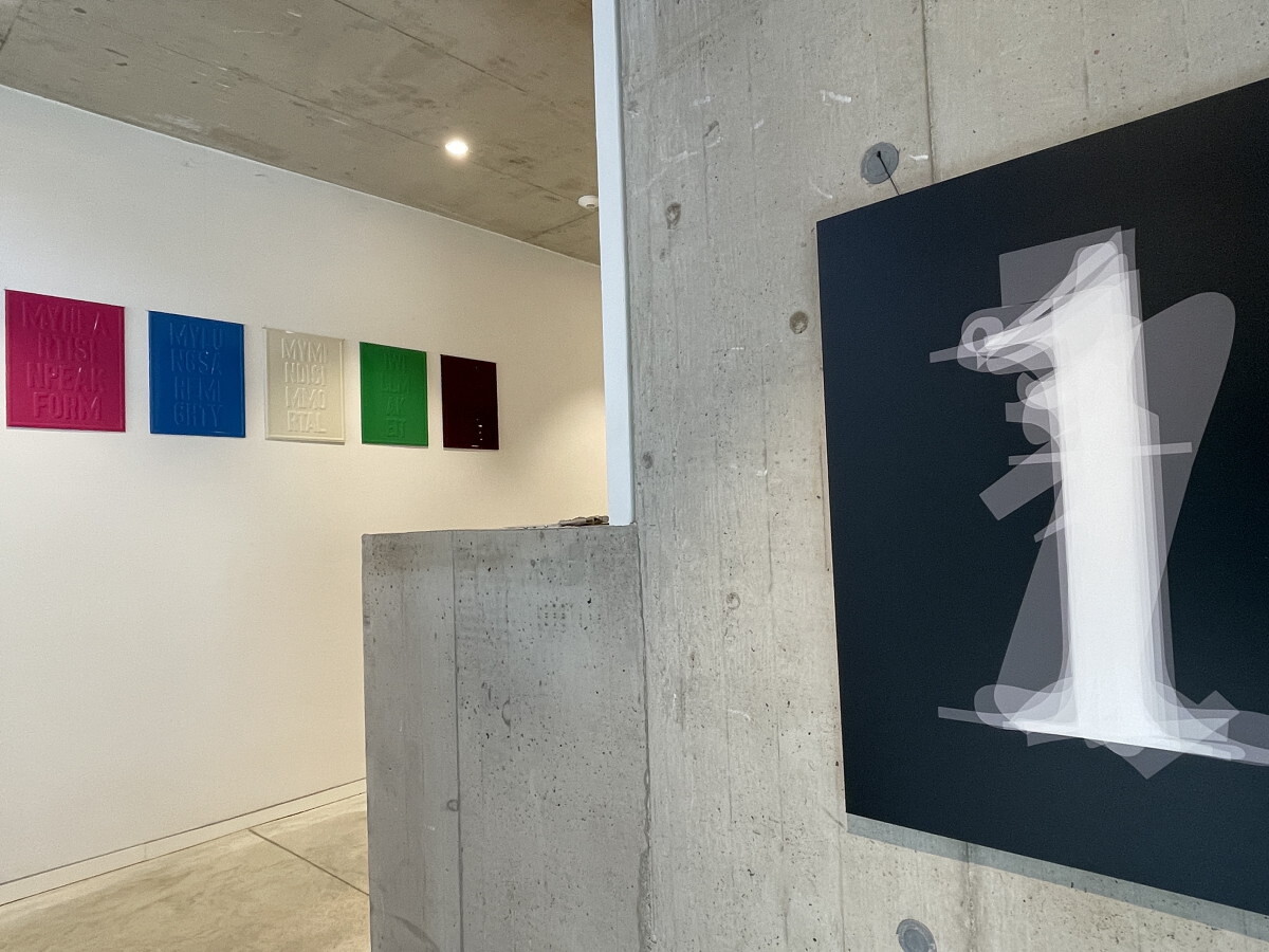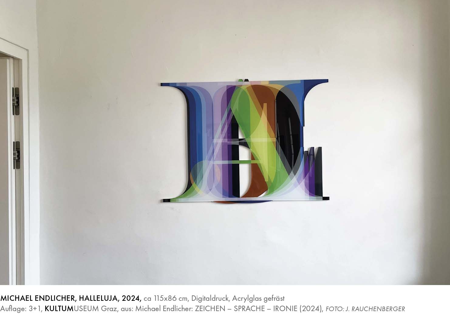Verdichten freilich ist ihm visuell ebenso wichtig. So kann es sein, dass sich Worte so verdichten, dass sich im Zusammenschieben ihrer jeweiligen Buchstaben formschöne Bilder ergeben. Um es vorwegzunehmen: „HALLELUJA“, das Frontbild am Anfang des Südganges im II. Stock, ist ein derartiges Bild; es wurde, wenngleich schon 2019 entstanden, ganz neu für diese Schau gefräst und geprintet. Es ist ausnahmsweise nicht ironisch, sondern schlicht und einfach schön. Oder vielleicht doch?