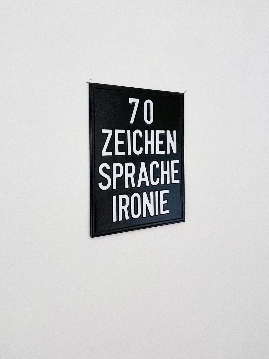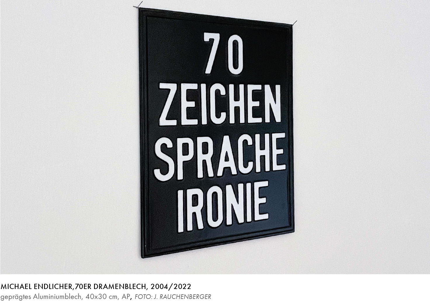 Der Titel der Ausstellung ist gleichzeitig auch ein „Dramenblech“, wie Endlicher eine Werkserie nennt, die über Jahre geht. Dieses beginnt mit der Zahl „70“: Die Wörter ZEICHEN – SPRACHE – IRONIE haben als Einzelworte, wenn man ihren alphanumerischen Wert jeweils zusammenzählt, jeweils die Summe „70“: