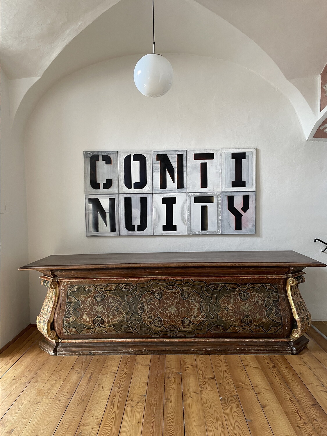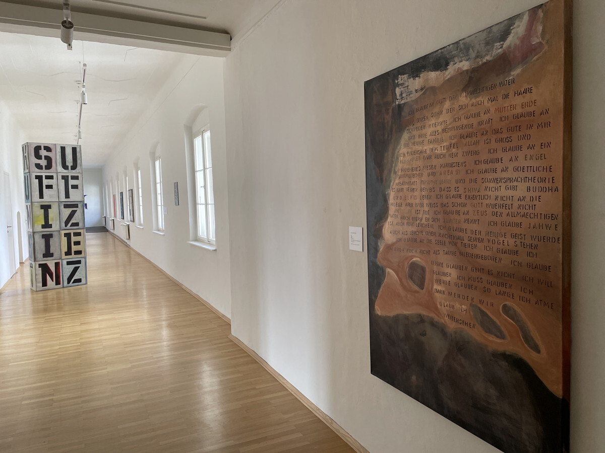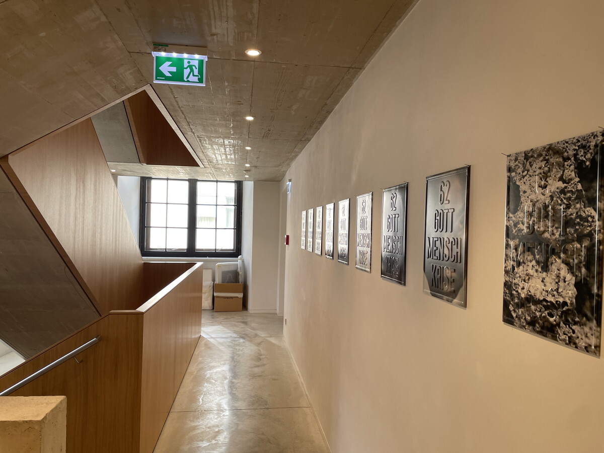 Man kann dort die Mystik all dieser Dramen von Gott, Welt und Existenz studieren: Dazwischen spannt sich die Ausstellung, die mit „01“ und „AZ“ bereits im Arkadengang beginnt und im traditionellen Stiegenhaus (Stiege Süd) zwischen dem zweiten und ersten Stock über den historischen Speisesaaltischen des Minoritensaals mit der Aufschrift „CONTINUITY“ und „DISRUPTION“ endet, auf einem sehr großen Ausstellungsareal auf.