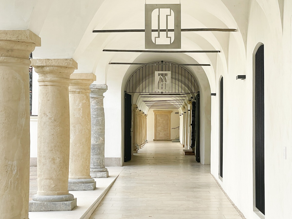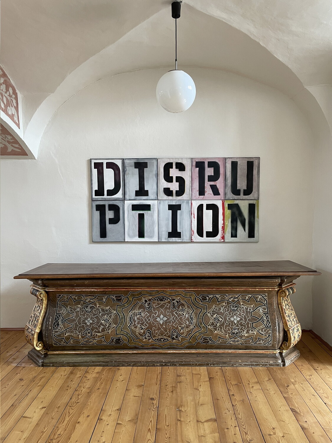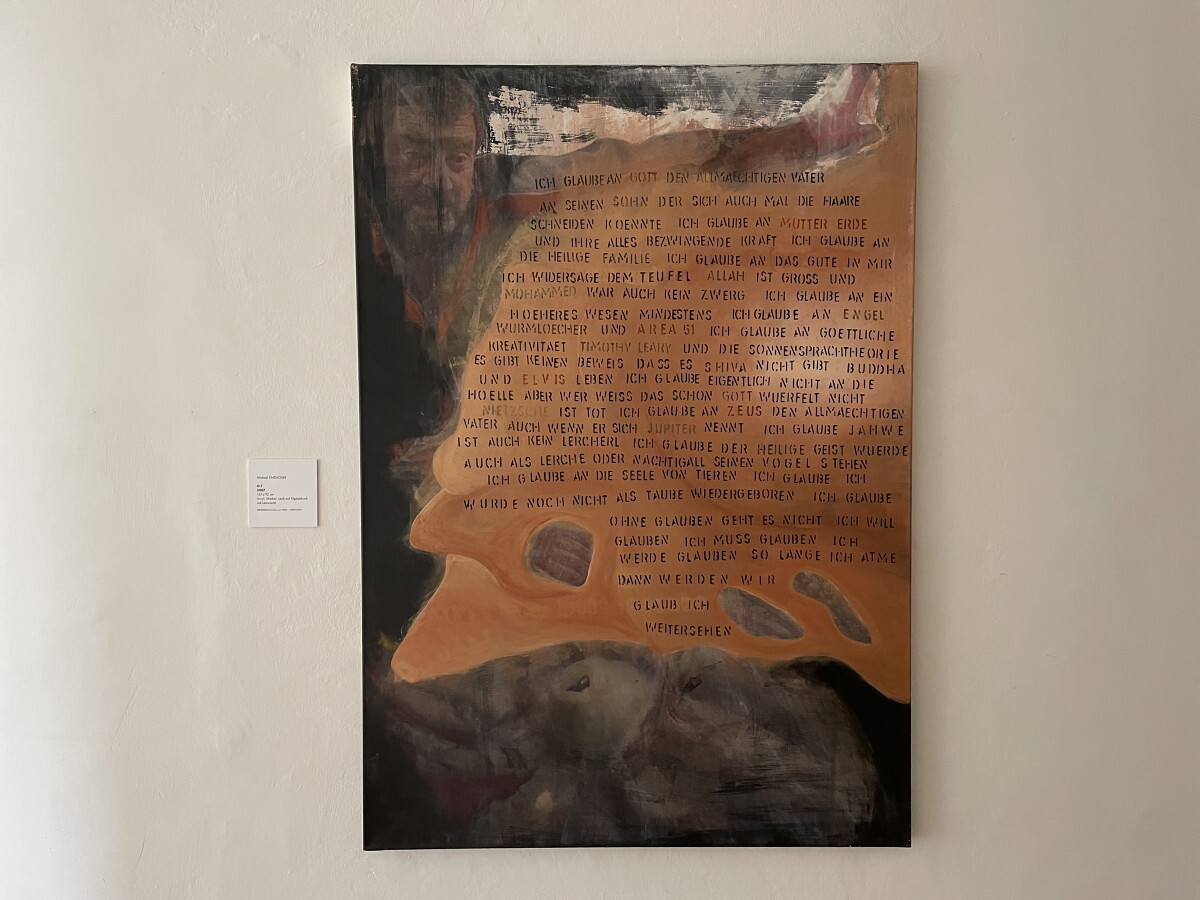 Man kann dort die Mystik all dieser Dramen von Gott, Welt und Existenz studieren: Dazwischen spannt sich die Ausstellung, die mit „01“ und „AZ“ bereits im Arkadengang beginnt und im traditionellen Stiegenhaus (Stiege Süd) zwischen dem zweiten und ersten Stock über den historischen Speisesaaltischen des Minoritensaals mit der Aufschrift „CONTINUITY“ und „DISRUPTION“ endet, auf einem sehr großen Ausstellungsareal auf.