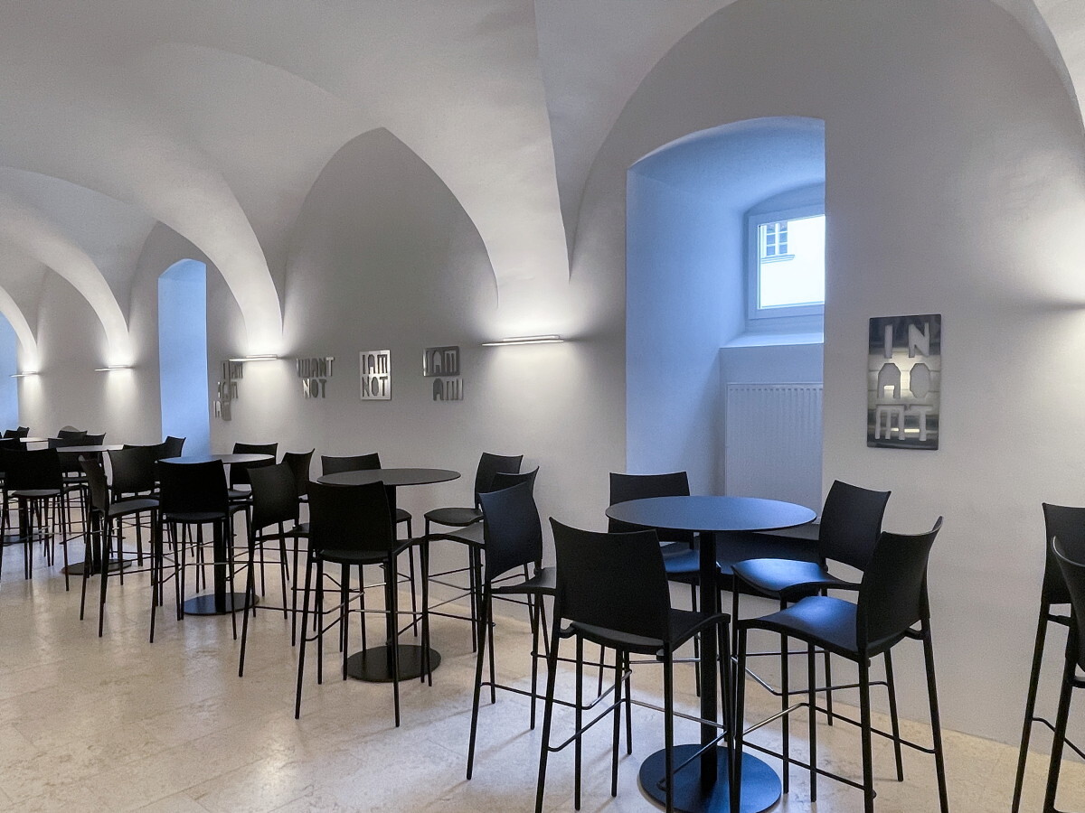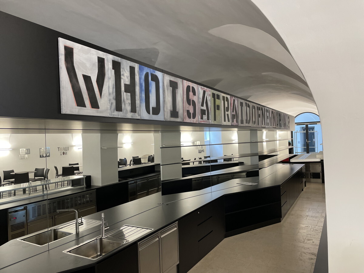 So ist seit der Eröffnung des neu renovierten Minoritenzentrums der die Spiegel und Stellagen für Gläser bekrönende Barbereich im Eingang zum Minoritensaal mit „WHO IS AFRAID OF NEW NORMAL?“ permanent bestückt: Eine Erinnerung an eine dramatische Zeit, mit dramatischen Aussagen zur „neuen Normalität“ (des damaligen Bundeskanzlers), damals als Block in der Ausstellung „EINATMEN – AUSATMEN“ präsentiert – der Ausstellung zur Wiedereröffnung des neu renovierten Minoritenzentrums, die sich nicht nur der Beseelung oder Beatmung des alten Gebäudes, sondern gleichzeitig, mitten in der Corona-Pandemie, um den „Atem“ sehr allgemein, auch jenen der Gesellschaft, kümmerte. Nicht nur um jenen für den eigenen Körper, sondern auch um jenen für die Gesellschaft.