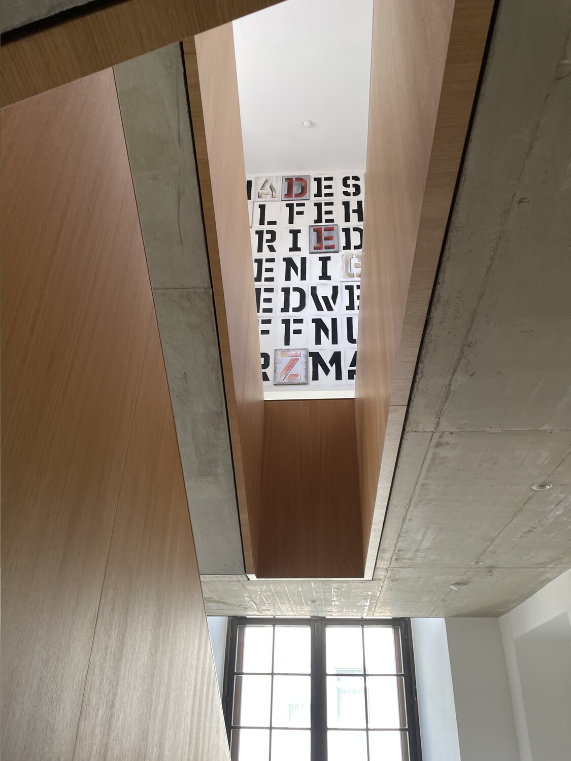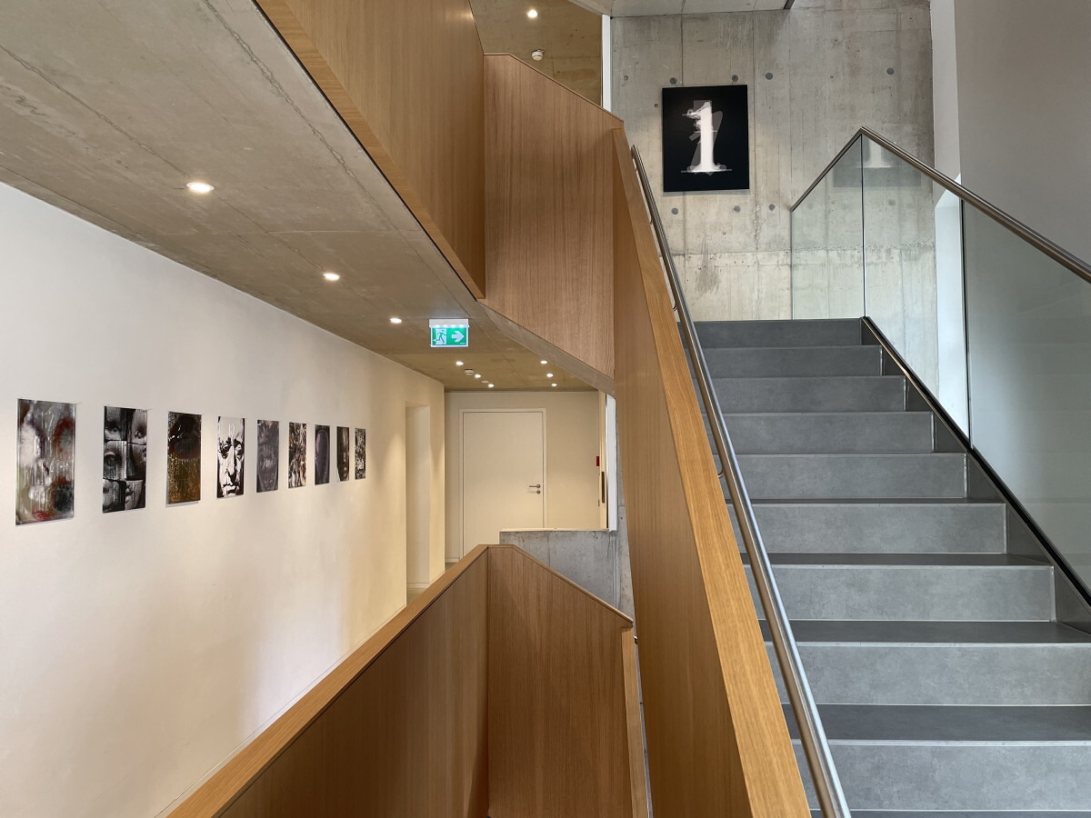 „Z“ ist auch das Ausstellungssujet. Es erinnert an Röntgenbilder. Michael Endlicher, Sohn eines Schriftsetzers, hat sich über die Jahrzehnte mit unterschiedlichsten Schriftschnitten beschäftigt. Hier hat er alle möglichen „Z“ übereinandergelegt und sie so einer sprichwörtlichen „Durchleuchtung“ unterzogen. In der Ausstellung werden noch Variationen von „A“ (gleich zu Beginn vor der Stiege), von „0“ und „1“ (an den Sichtbetonfronten der jeweiligen Stiegenläufe in den entsprechenden Geschoßen) folgen. Zu durchleuchten, durch die Oberflächen hindurch, nicht nur zu verdichten, ist Endlichers grundsätzliche Strategie, wenn er Kunst macht.