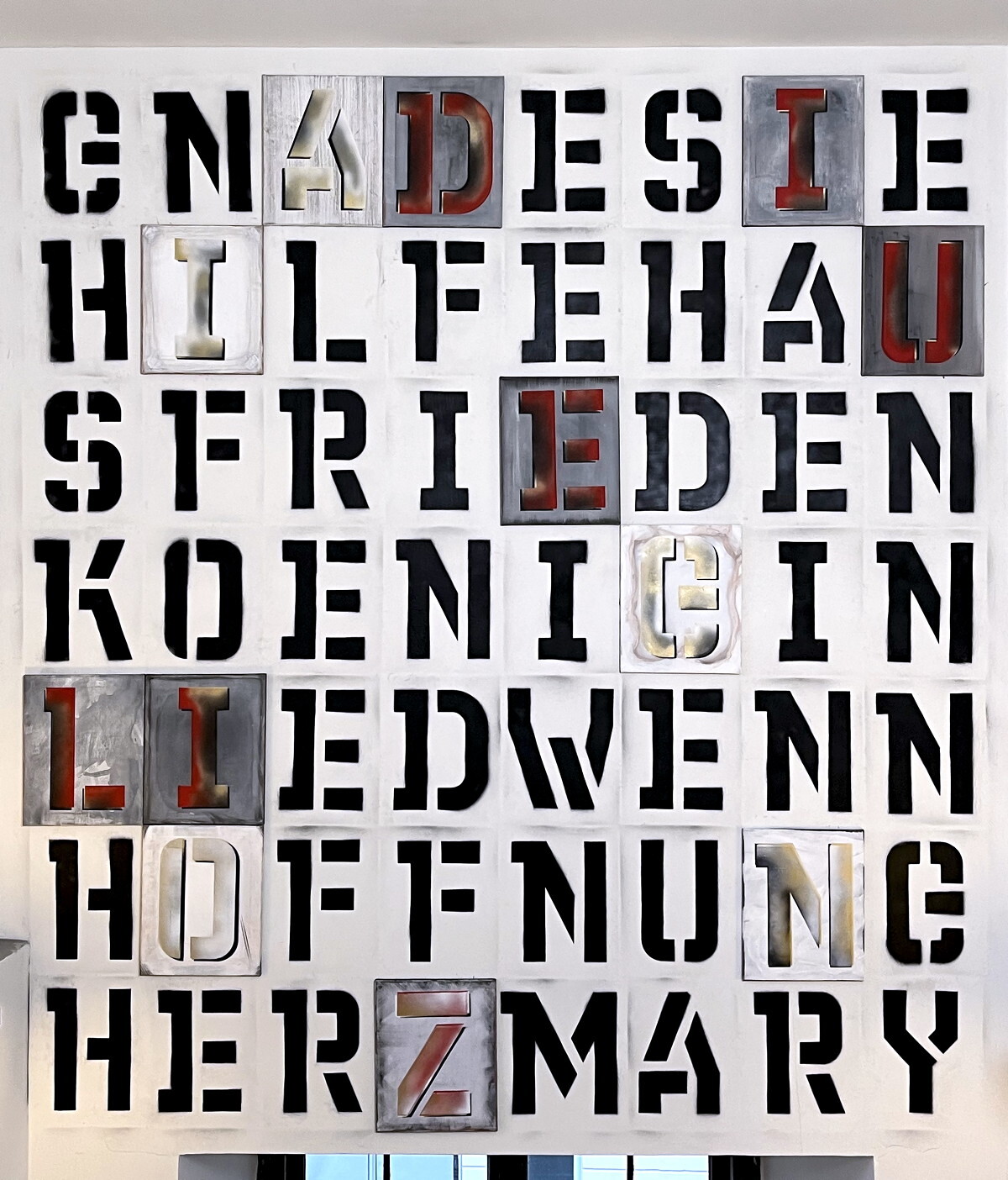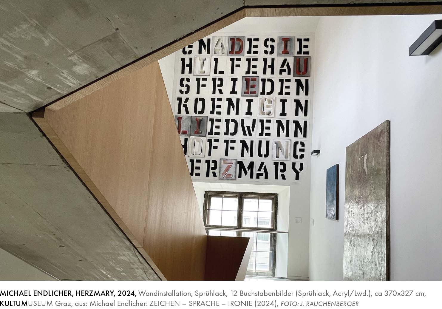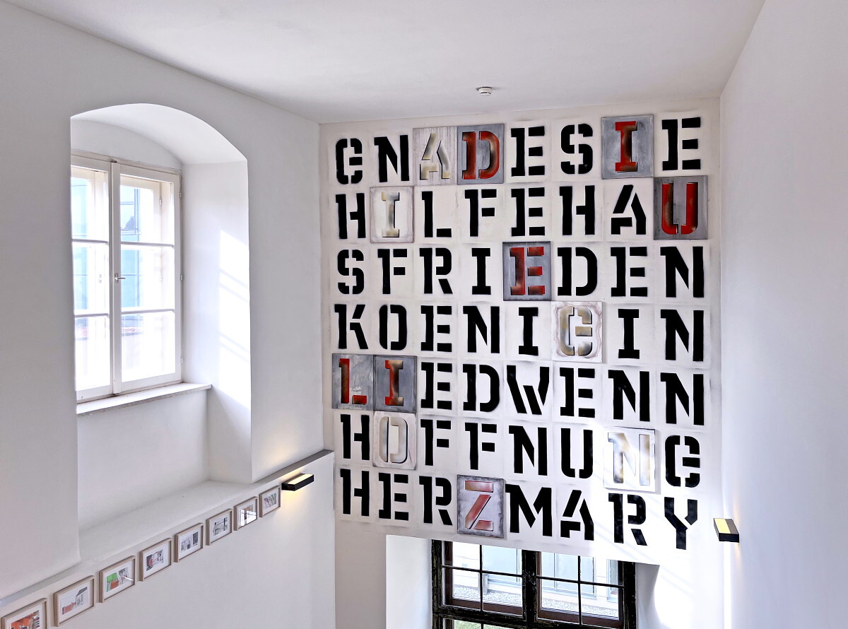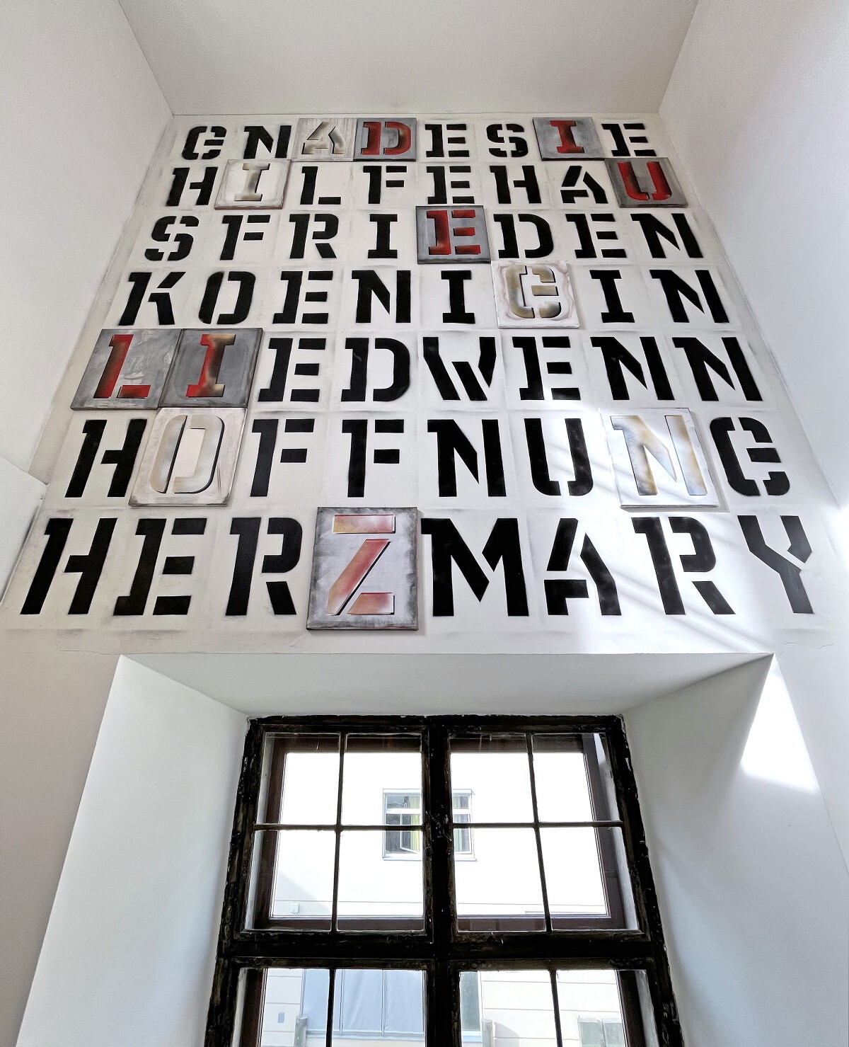 Für das Minoritenzentrum gestaltete er für diese Ausstellung die hohe, zwei Stockwerke umfassende Westwand des neuen Stiegenhauses mit dem Titel: „HERZMARY“. Sie wird Teil eines neuen Museumszugangs und interpretiert den Ort „Mariahilf“ neu: Die Arbeit kondensiert mit exakt 56 Einzelbuchstaben ein altes Wallfahrtslied dieses Ortes und setzt dabei den gesprayten Buchstaben. die die Greundebene bilden, zwei „Fremdworte“ als reale Buchstabenbilder entgegen. Das eine ist selbstredend in Gold, das andere in Rot gehalten: Die mittelalterliche Mystikerin Hildegard von Bingen (1098-1179) hatte ein seltsames Glossar erfundener Wörter – mehr als 1000 – in einer eigenen Geheimsprache geschaffen. Jene für „Gott“ und „Teufel“ lauten: „AIGONZ“ und „DIJELIZ“ – treffen sich in jenem Buchstaben, der nicht nur in dieser Ausstellung eine wichtige Rolle spielt: dem Z. Die Installation endet jedenfalls im Gleichklang mit der Intention des Ursprungstextes: HoffnungHerzMary.
