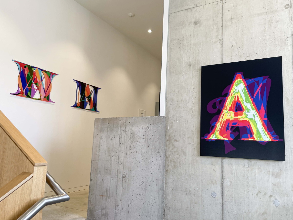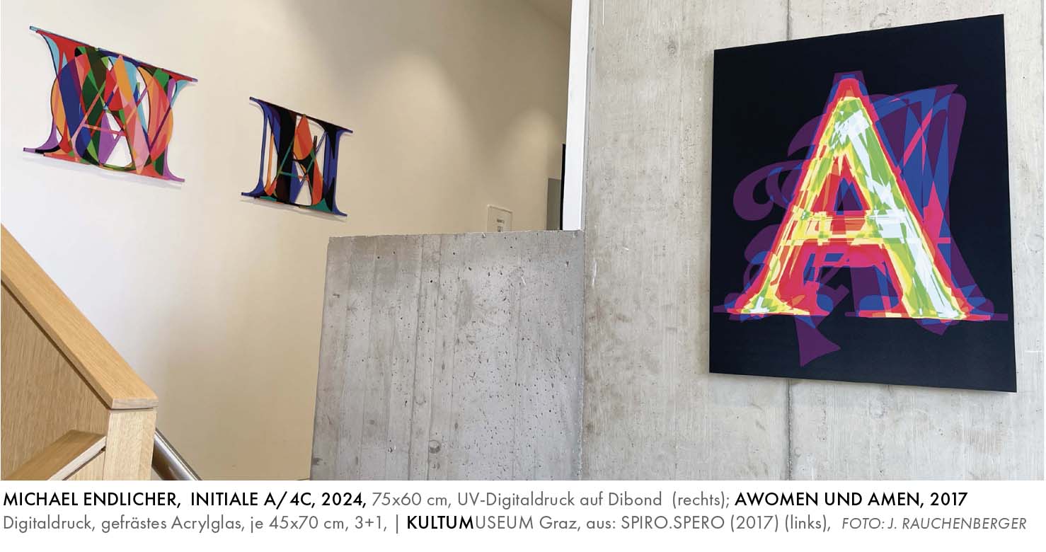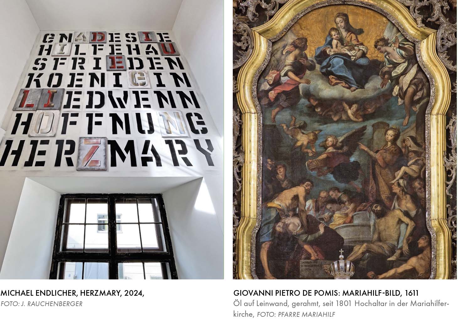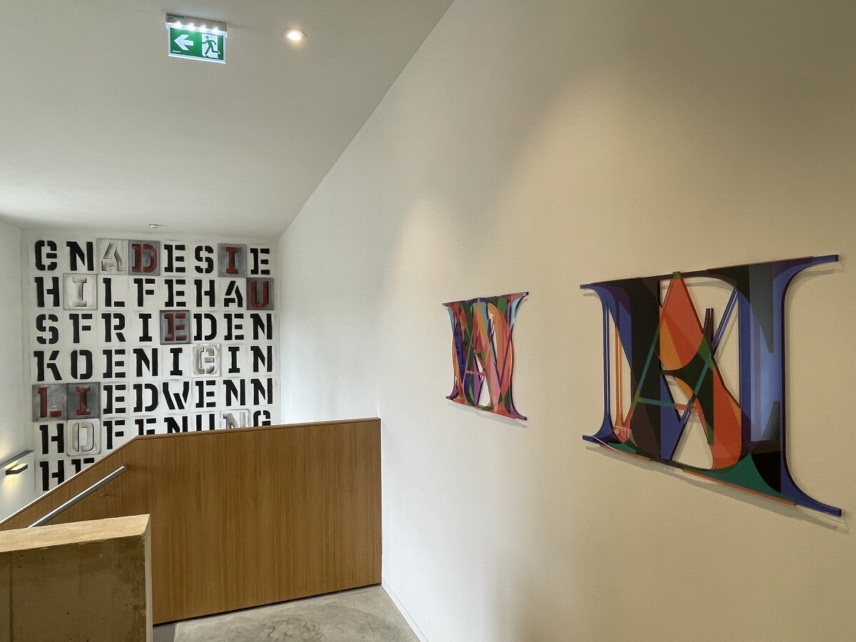 Für das Minoritenzentrum gestaltete er für diese Ausstellung die hohe, zwei Stockwerke umfassende Westwand des neuen Stiegenhauses mit dem Titel: „HERZMARY“. Sie wird Teil eines neuen Museumszugangs und interpretiert den Ort „Mariahilf“ neu: Die Arbeit kondensiert mit exakt 56 Einzelbuchstaben ein altes Wallfahrtslied dieses Ortes und setzt dabei den gesprayten Buchstaben. die die Greundebene bilden, zwei „Fremdworte“ als reale Buchstabenbilder entgegen. Das eine ist selbstredend in Gold, das andere in Rot gehalten: Die mittelalterliche Mystikerin Hildegard von Bingen (1098-1179) hatte ein seltsames Glossar erfundener Wörter – mehr als 1000 – in einer eigenen Geheimsprache geschaffen. Jene für „Gott“ und „Teufel“ lauten: „AIGONZ“ und „DIJELIZ“ – treffen sich in jenem Buchstaben, der nicht nur in dieser Ausstellung eine wichtige Rolle spielt: dem Z. Die Installation endet jedenfalls im Gleichklang mit der Intention des Ursprungstextes: HoffnungHerzMary.
