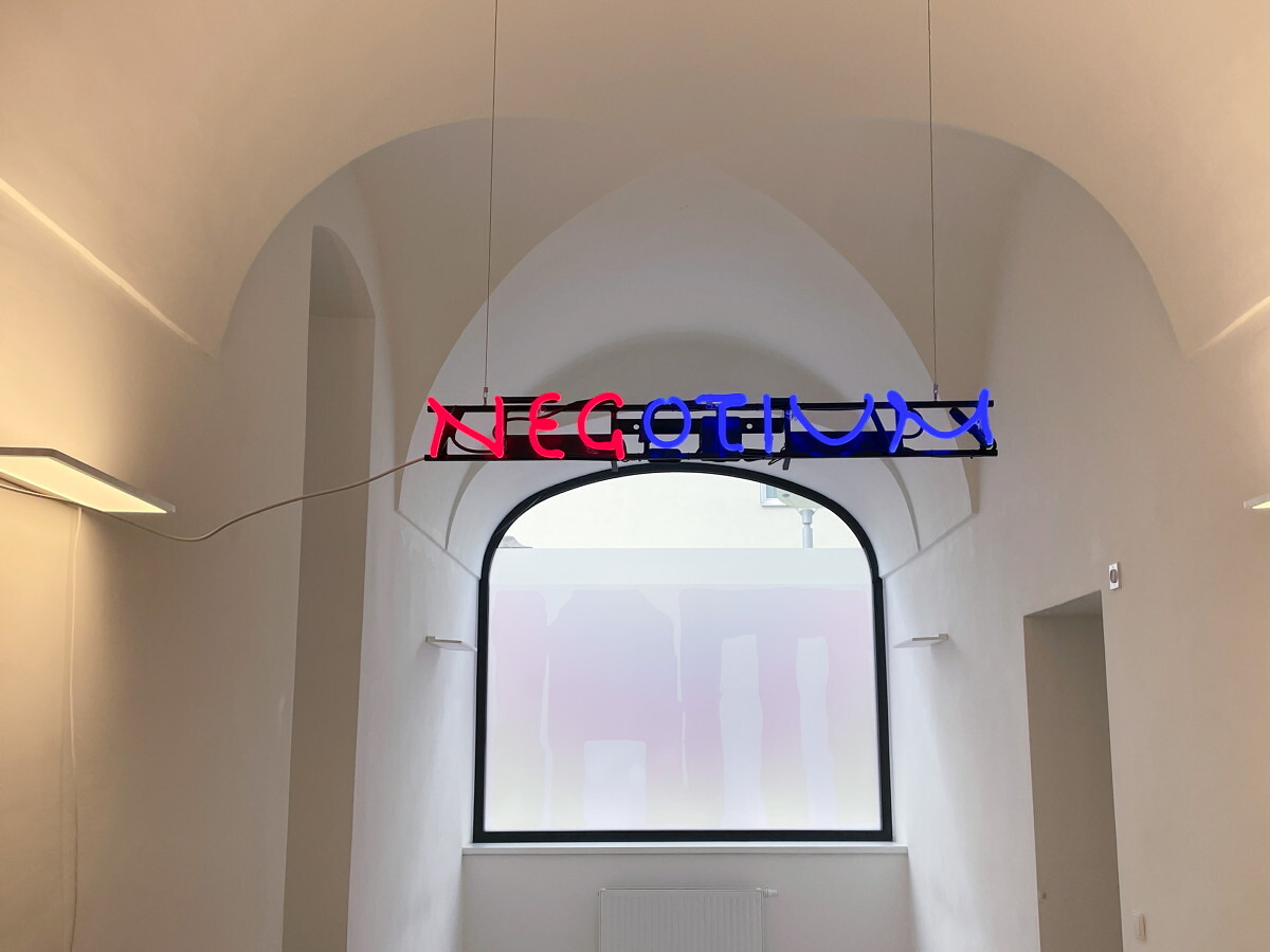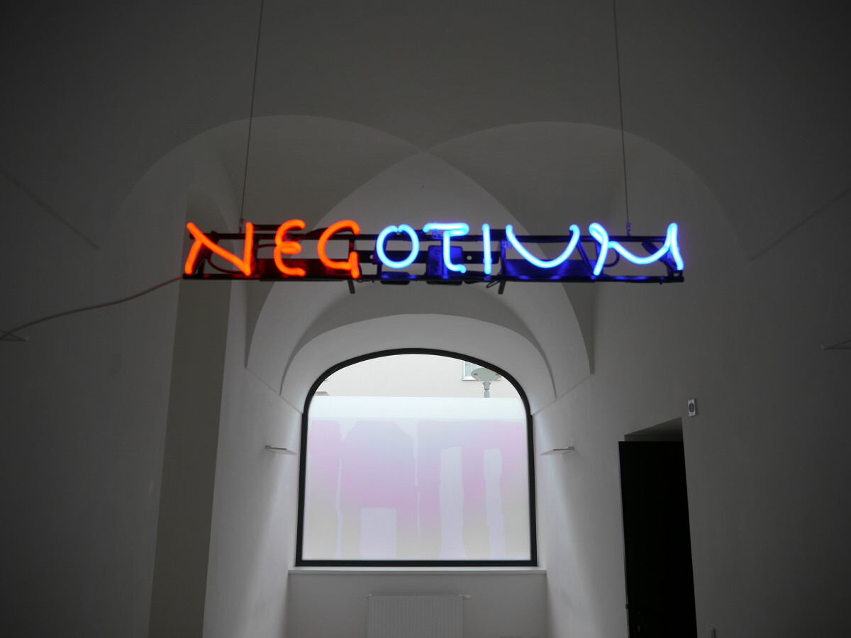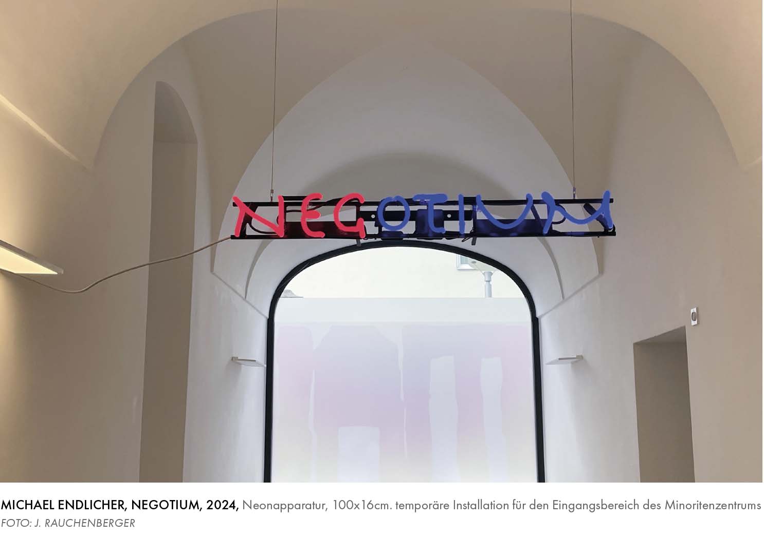 Orte sind für Michael Endlicher bestimmend, wenn er seine Kunst zeigt oder auf sie „reagiert“. Das können verfallende Hauswände sein, oder, wie zuletzt, ein großer Screen am Wiener Graben. Die Ur-Bausteine von Schrift und digitaler Welt, AZ und 01, mit denen er hier im Minoritenzentrum seine Ausstellung beginnt, werden hier freilich substanziell in ein „Mission Statement“ dieses Ortes überführt. Denn ein regelmäßig blinkendes rotes „NEG“ drängt sich allen Besucherinnnen und Besuchern auf, wenn man sich dem Eingang nähert. „NEG“ klingt nach Verneinung. Was aber wird verneint?