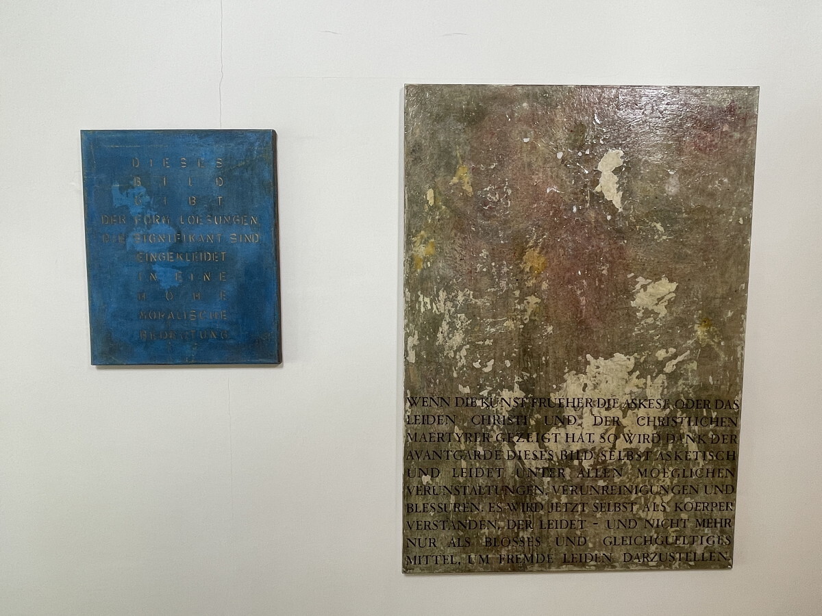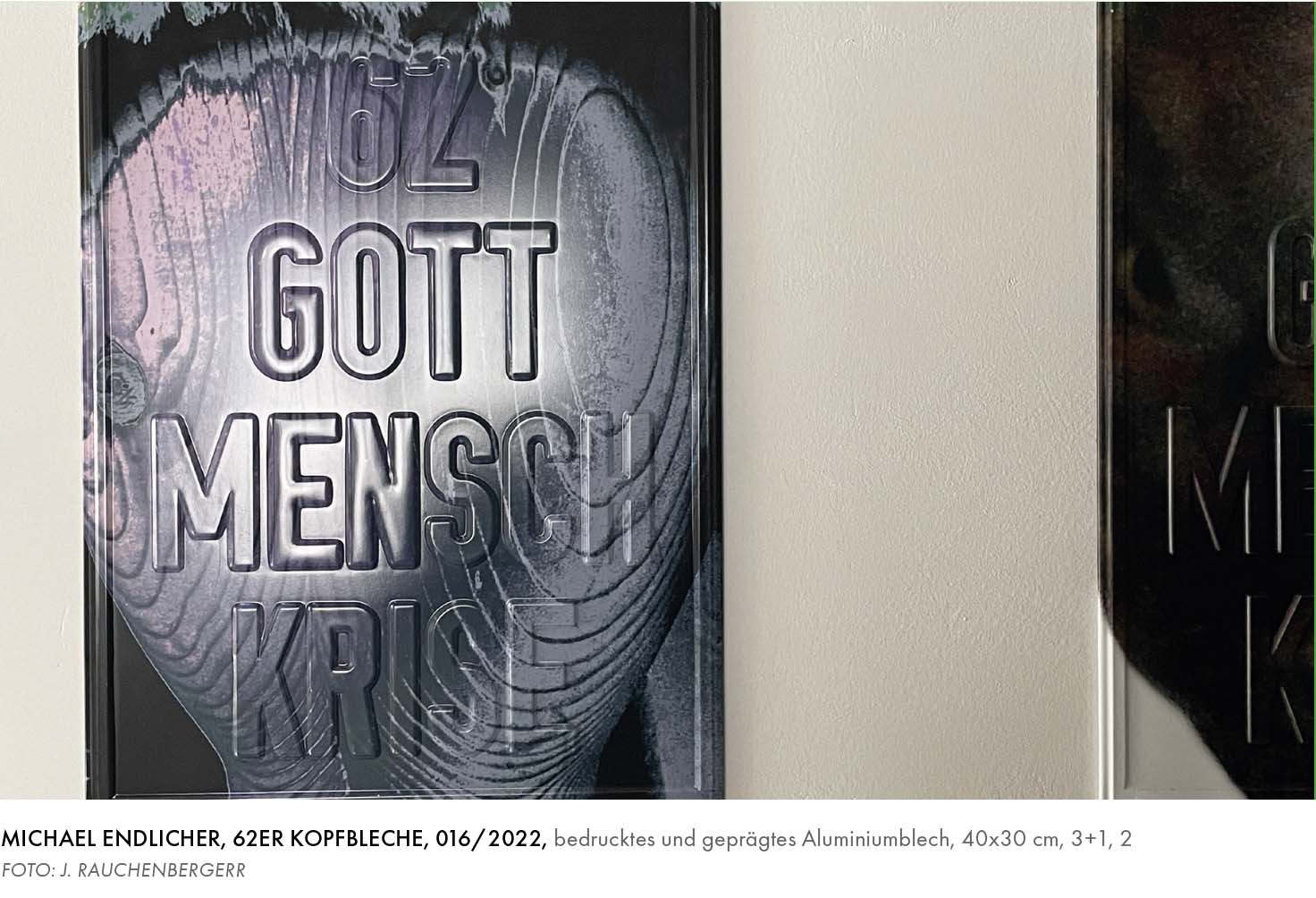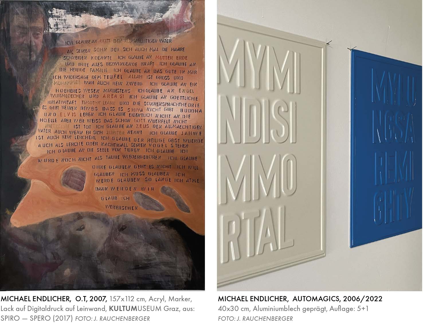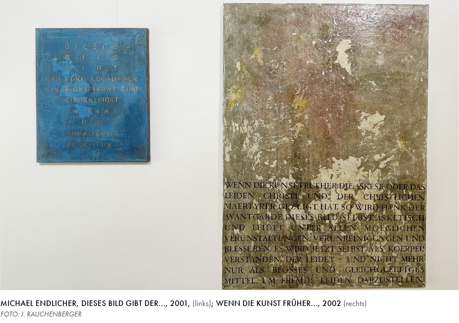 Auffällig in Endlichers künstlerischem Erkunden von Sprache, Bild und Bedeutung ist seine Nähe zu religiösen Sprachspielen oder auch -diskursen, die sich über Jahre vor allem in der Thematisierung von Litanei-ähnlicher Sprache manifestierte. Aber auch das Medium Bild als solches wird auf der Basis religiöser Bildgeschichte reflektiert. So lautet eine Inschrift auf einem frühen Bild (2001) aus dieser Ausstellung: „WENN DIE KUNST FRÜHER ASKESE ODER DAS LEIDEN CHRISTI UND DER CHRISTLICHEN MÄRTYRER GEZEIGT HAT, SO WIRD DANK DER AVANTGARDE DIESES BILD SELBST ASKETISCH UND LEIDET UNTER ALLEN MÖGLICHEN VERUNSTALTUNGEN, VERUNREINIGUNGEN UND BLESSUREN. ES WIRD JETZT SELBST ALS KÖRPER VERSTANDEN, DER LEIDET – UND NICHT MEHR NUR ALS BLOSSES UND GLEICHGÜLTIGES MITTEL, UM FREMDE LEIDEN DARZUSTELLEN.“