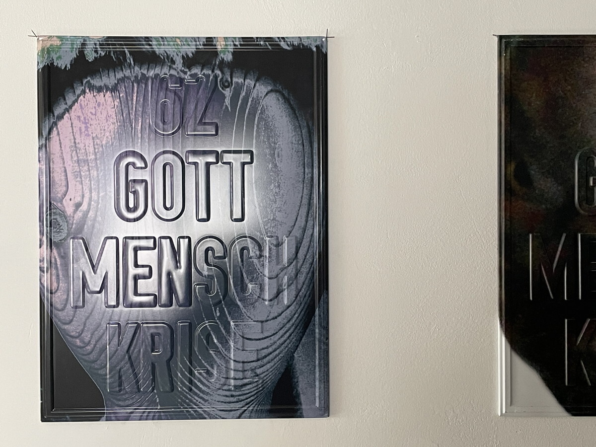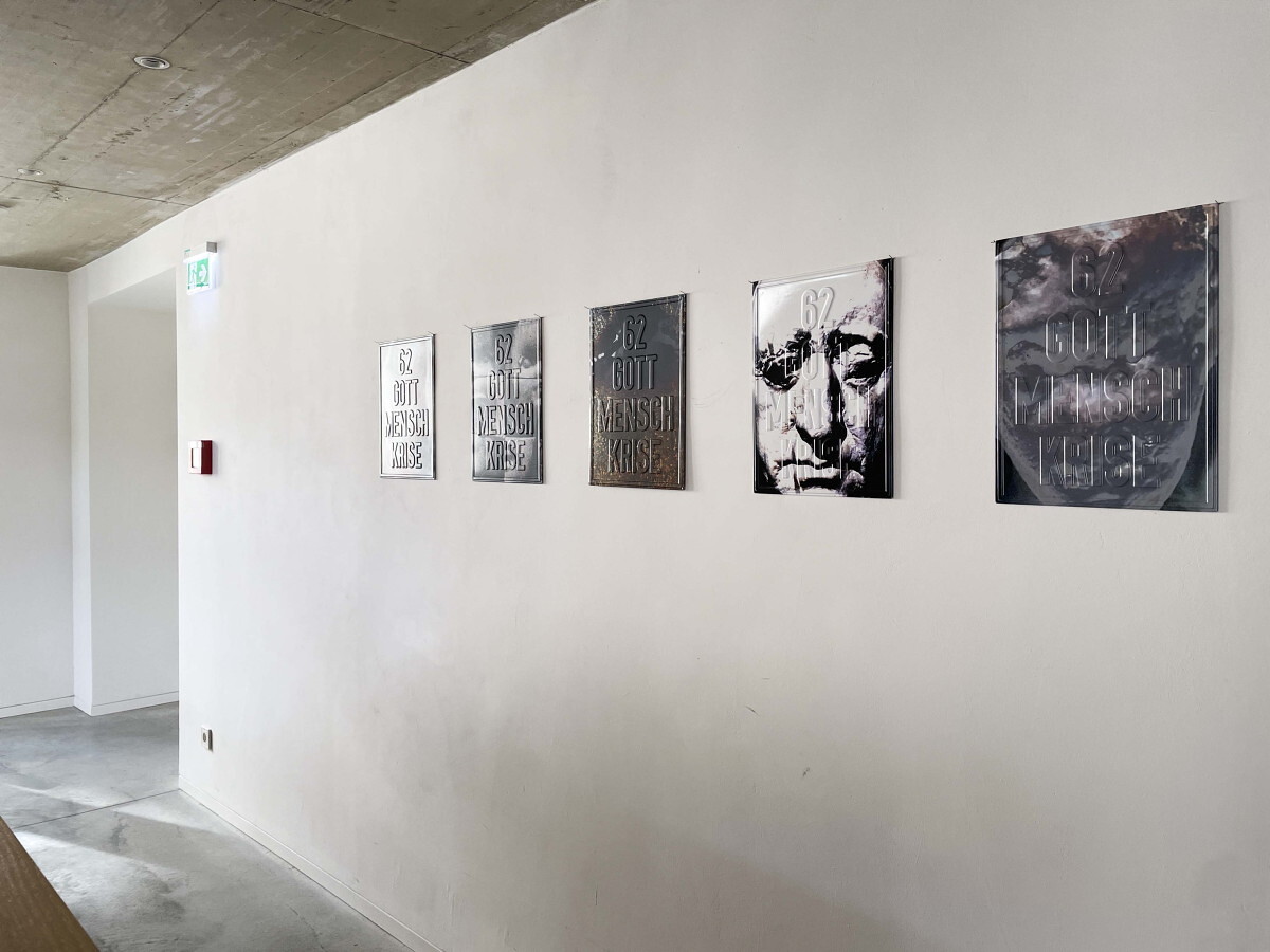 GOTT – MENSCH – KRISE bilden demnach ebenfalls, wie oben bereits erwähnt, das Verfahren des alphanumerischen Werts ab: Nur ist diese Serie nicht einfach eine von leicht lesbaren Worten, vielmehr sind es Bilder, deren Hintergrund mit den Worten und der Zahl „62“ geprägt sind. GOTT, dessen Wert 62 ausmacht, MENSCH, dessen Zahlenwert ebenso 62 ausmacht, werden in das Wort KRISE dramatisiert.