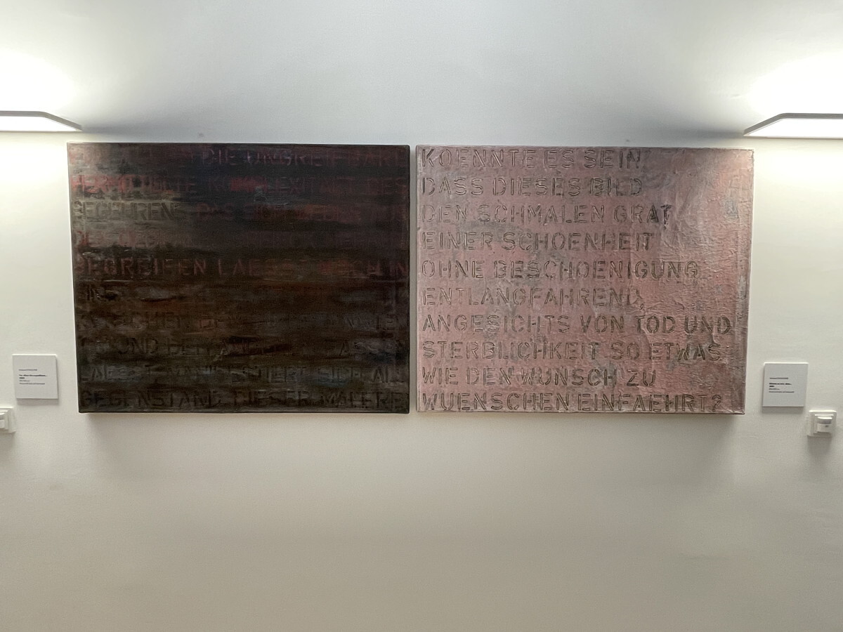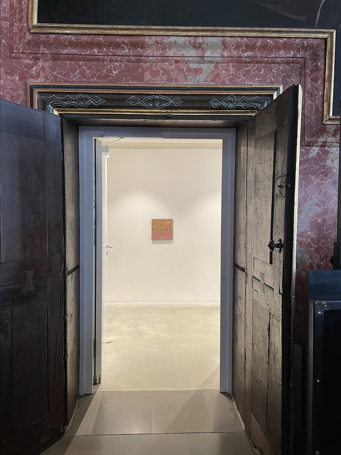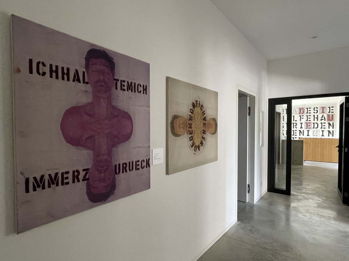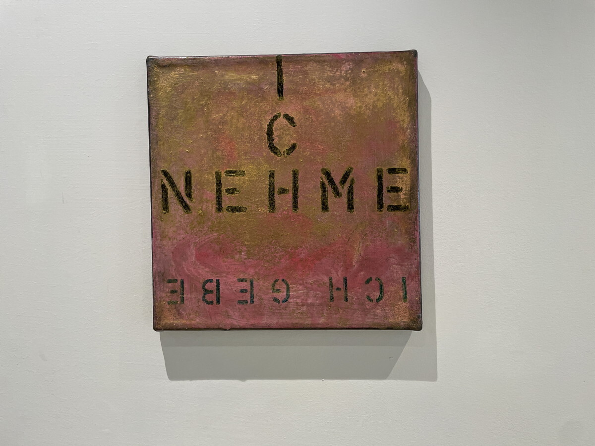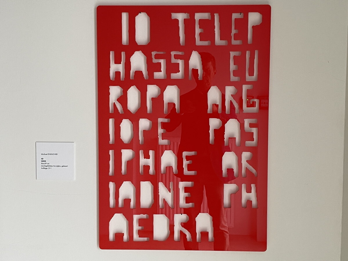 Man könnte diese „Site-Spezifik“ aber auch an der Auswahl der gezeigten Bilder festmachen. Wenn man aus dem barocken Minoritensaal in den neu gestalteten Stiegen-West-Trakt blickt, ist in ziemlicher Tiefhängung ein kleines Bild mit dem Satz: „ICH NEHME“ zu sehen; umgedreht ist es aber auch mit „ICH GEBE“ zu lesen: Mitunter kann man Endlichers Bilder drehen.