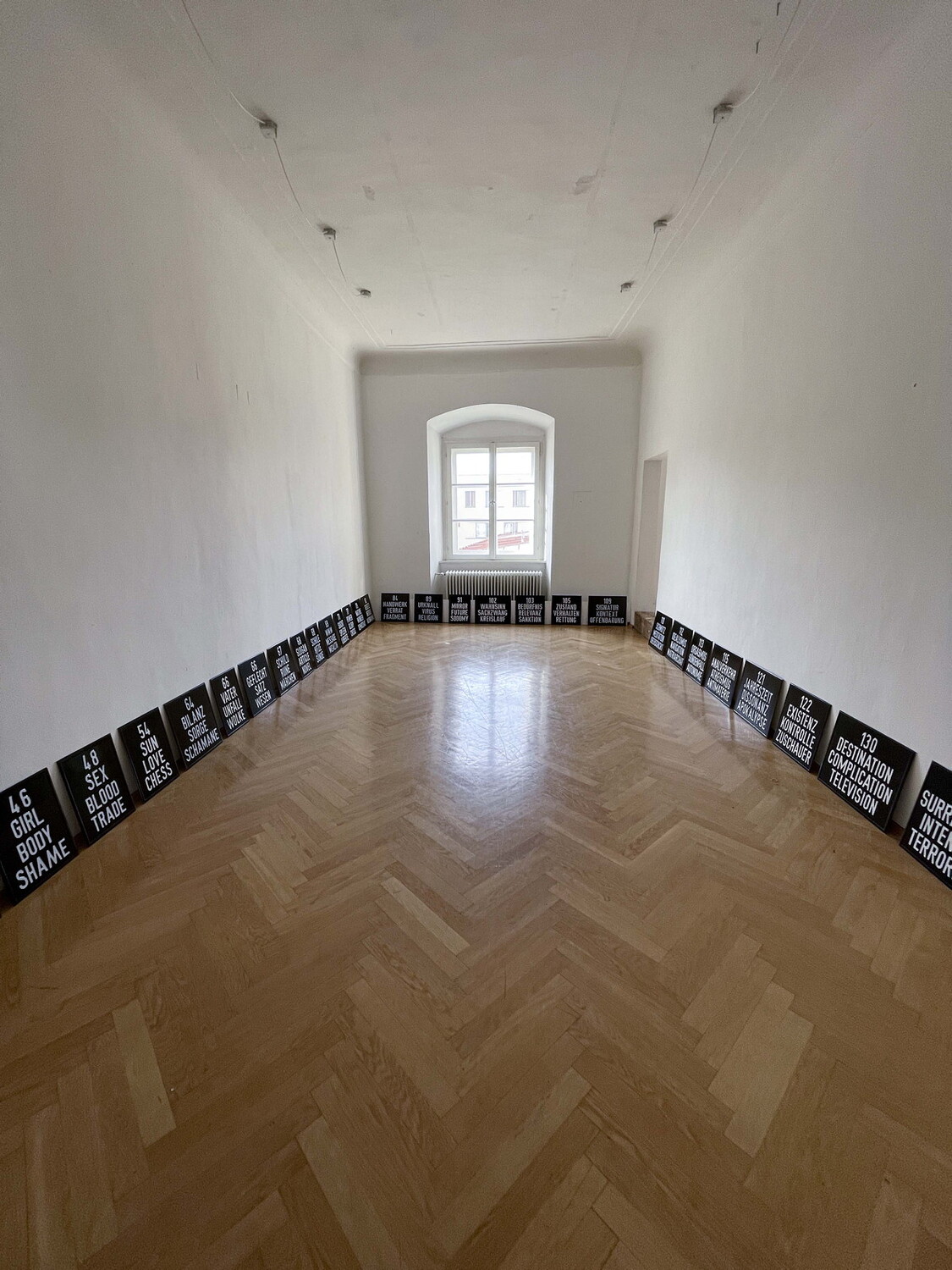 Die beiden „Zeichen“ werden in der Ausstellung mehrmals wiederkehren, als scheinbare Zählung der Stockwerke, wenn man die Stiegen hochsteigt. In ihnen ist sozusagen vorab alles gesagt – die Realität der virtuellen Welt und der Inhalt, zu der Buchstaben in ihren Kombinationen fähig sind. Sie flackern leicht im leichten Wind. „Z“ ist im Kontext der Gegenwart des andauernden Ukraine-Kriegs freilich auch ein Widerstand gegen seine Besetzung durch russische Propaganda und der Treue zu Putin.