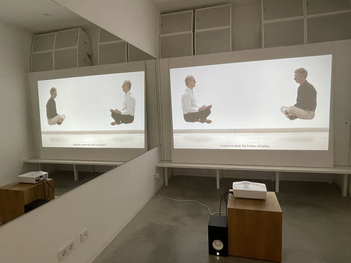 „Leibhaftig plurifakt“, das diesem großen „Credo“ anschließende Werk, zersetzt den Künstler leiblich bis hin zu Auflösung ins Nichts. „Ich halte mich immer zurück“ oder „Ich vertraue immer dem Wort“, die zwei Siebdrucke, die mit diesem Video kombiniert sind, ist auch ein Spiel mit der Künstleridentität, über vermeintliche Erfolge und: Verzweiflungen.