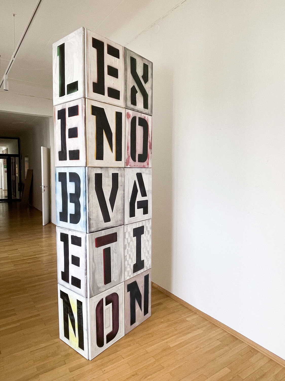 Die Faszination des Künstlers für seine beweglichen Lettern als Bilder führte ihn auch in Drei-Dimensionalität. Bildertürme entstanden schließlich, einer ist auch im Südgang des 2. Stocks zu sehen: Der „EXNOVATION“ (Ausstiegsprozesse aus nicht-nachhaltigen Strukturen im Gegensatz zur INNOVATION) auf der einen Seite steht die „SUFFIZIENZ“ (das richtige Maß im Gegensatz zur Effizienz) auf der anderen Seite gegenüber; auf den Schmalseiten hinterfragen LEBEN und KUNST einen vermeintlichen (?) Gegensatz.
