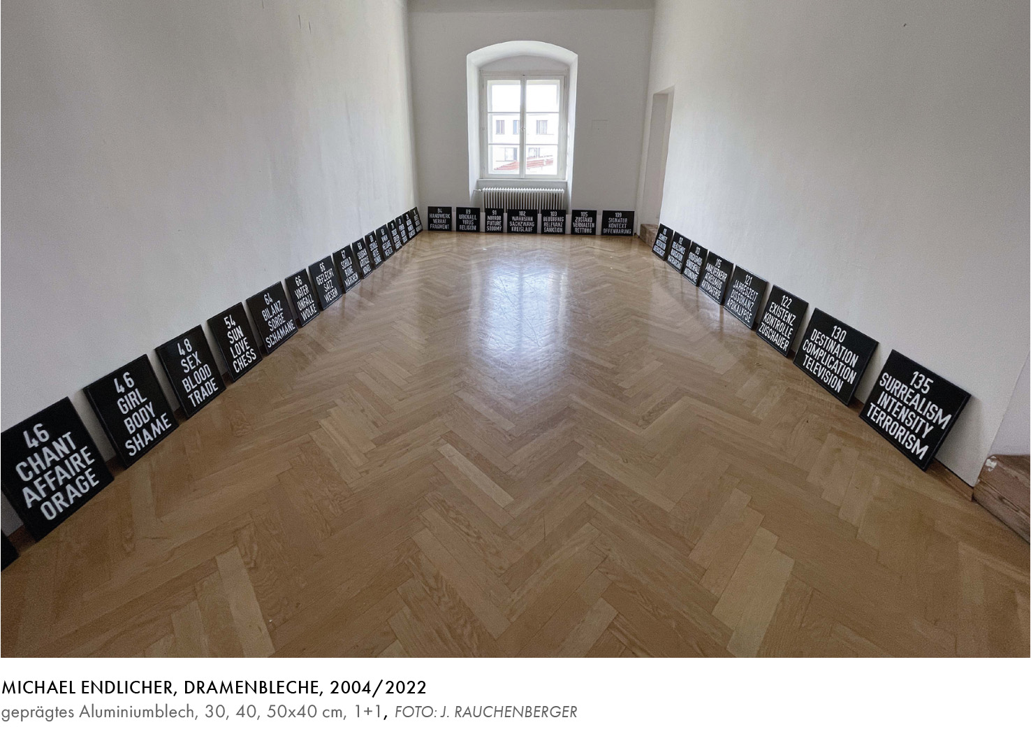 Ein Beispiel von Endlichers bekannten „Dramenblechen“, das hier den Titel der Ausstellung bildet. Drei Worte also, drei Zeilen, darüber eine Zahl: Hinter Michael Endlichers „Dramenblechen“ stehen die „alphanumerischen Codes“. Das ist eine bis in die jüdische Kabbala reichende Technik, nach einer Mystik des Wortes zu suchen und sie scheinbar rational zu begründen. Viele solcher geprägter Blechtafeln – eigentlich in Schwarz-Weiß – sind in der letzten (oder ersten – es kommt darauf an, welchen Weg man wählt) Ausstellungszelle im II. Stock des Minoritenklosters am Boden aufgereiht.