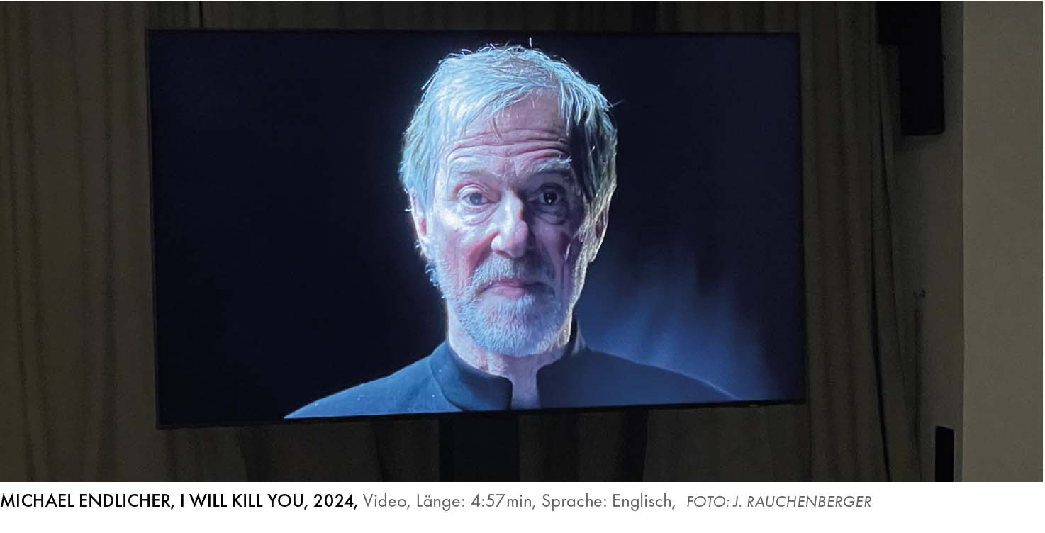 Sie ist – freilich völlig pervertiert – auch noch in der jüngsten, hier erstmals zu sehenden Arbeit auffindbar, die als eine der ersten in dieser Ausstellung im Kleinen Minoritensaal zu sehen ist: „I WILL KILL YOU“. Ein Video „über das Töten, das erbarmungslose Morden“, das uns unmenschlich (?) macht. Oder macht es uns erst zum Menschen, zum Un-Tier? Der Künstler kann „nichts verhindern – aber versuchen, den Schrecken zu bannen“ wenn er ihn „ausspricht, zerredet“ (Michael Endlicher), wie er über dieses jüngste Werk zu Protokoll gibt. Überraschung am Ende: Da ist er selbst der Totgeweihte und wartet auf die Exekution.