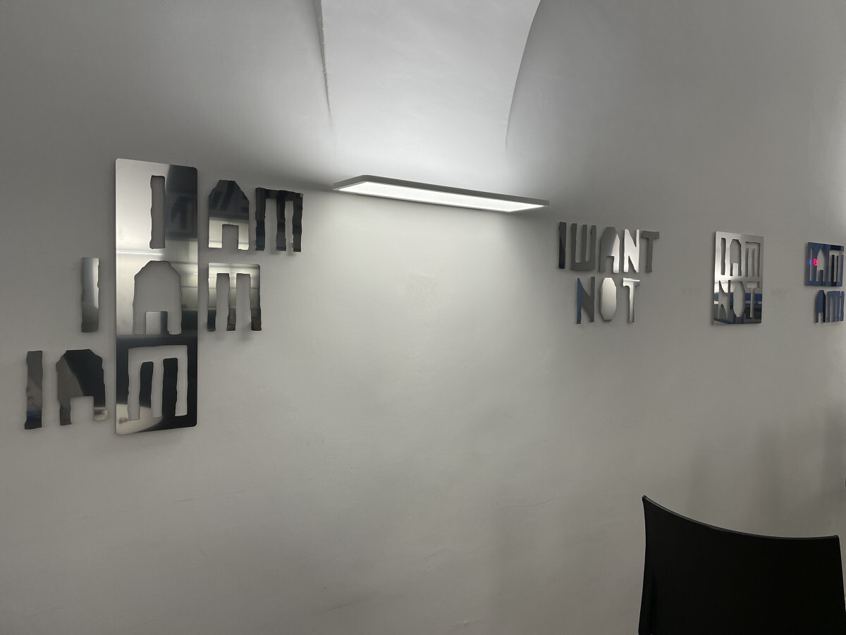 Die für diese Ausstellung neu entstandene Spiegelschrift im Barbereich reflektiert – wörtlich genommen – das Gegenüber mit seiner Frage nach der Angst vor der neuen Normalität: „Who is afraid of?“ „AM I?“, „I AM“. „I AM NOT…“ Bitte auswählen! Beim Lesen der Schrift – wenn man auf dem Barhocker sitzt, bei einem Glas Wein, einem Bier, einem Wasser, was auch immer, kommt man jedenfalls um die eigene Spiegelung nicht herum.