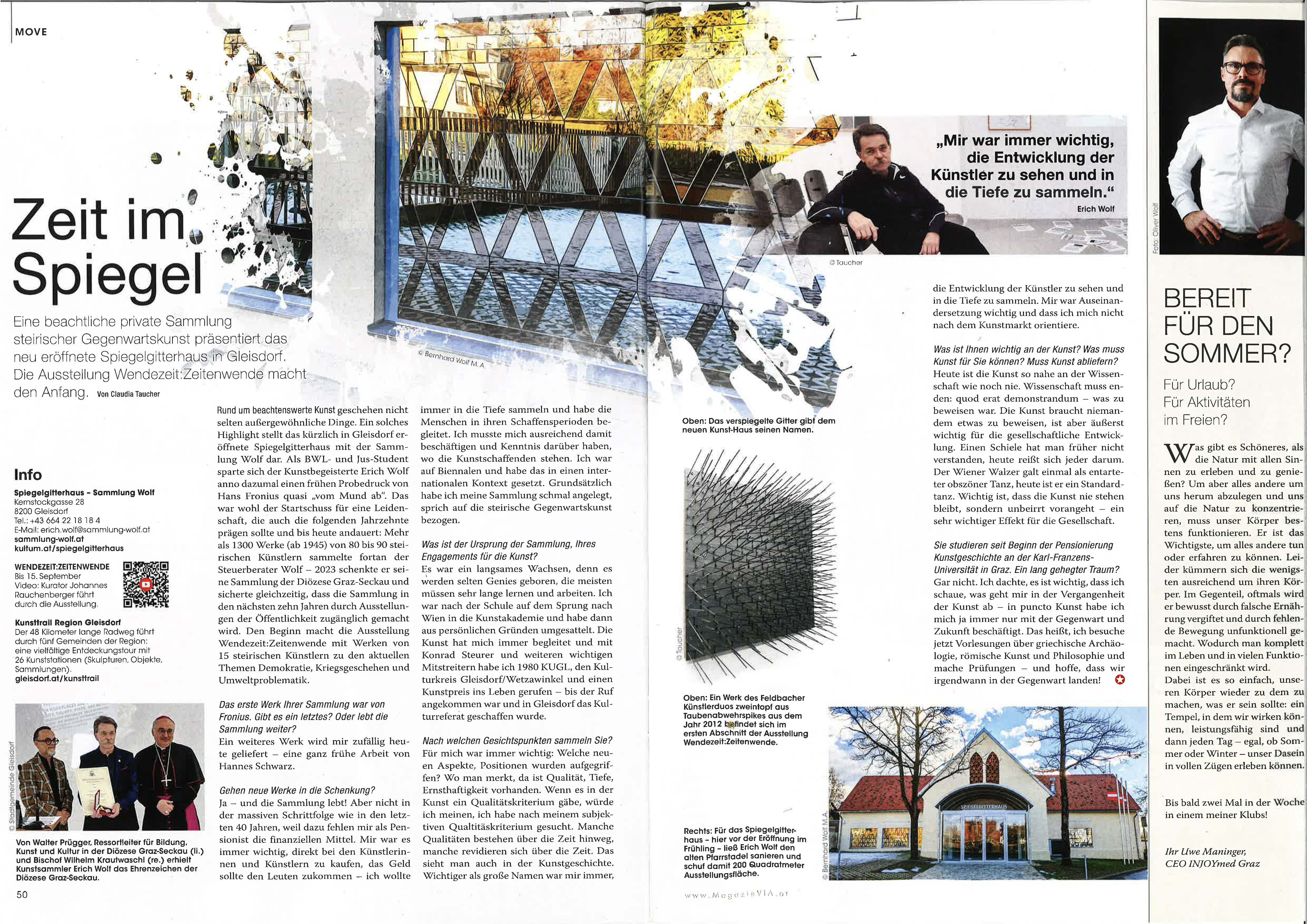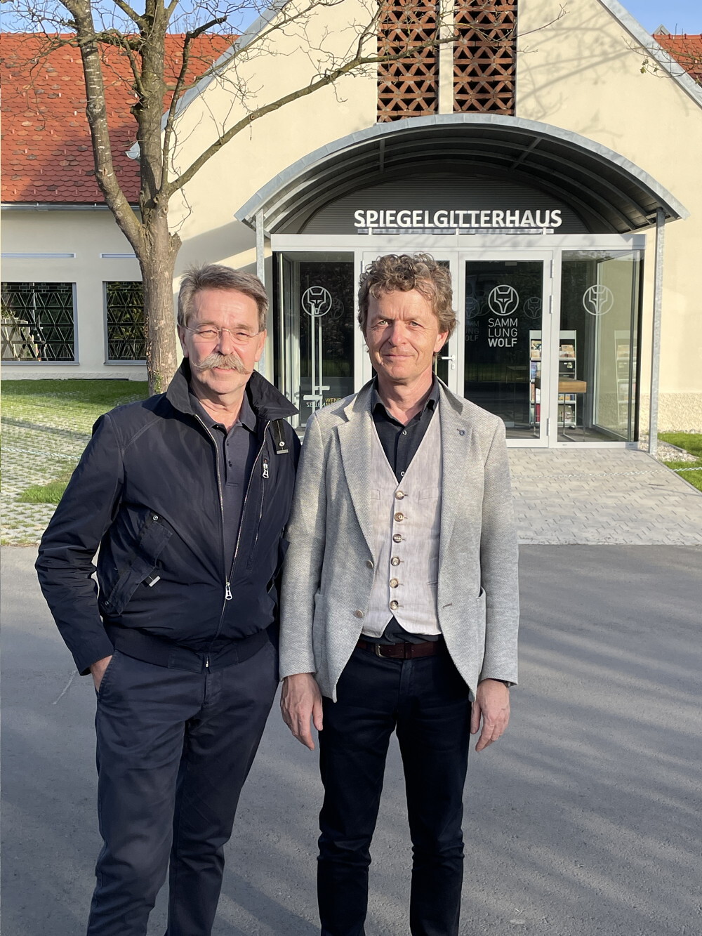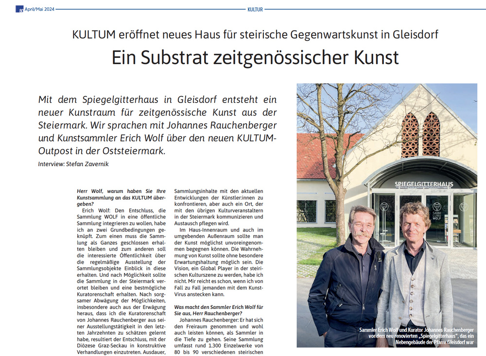 In einer gewissen Weise haben sich Erich Wolf und die katholische Kirche auf dieser Wellenlänge getroffen, auch hier wurde nachhaltig getauscht: 2023 schon hat die Pfarre Gleisdorf das Gebäude, in dem wir uns hier befinden, und das Grundstück als Gegengabe zur Schenkung der Kunstwerke – mehr als 1.300 Einzelwerke! – an die Diözese Erich Wolf geschenkt. Erst 2070 könnten die Werke auch verkauft werden – die Kirche hat einen längeren Atem als andere. Dieser „Pfarrstadl“ wurde im Vorjahr schneller als angenommen, mit beharrlicher Akribie seines Bauherrn, die bis zur Umbenennung auf Google Maps reichte, zu einem beachtlichen Ausstellungsraum umgebaut. Über den Winter „ausgetrocknet“ wird es nun eröffnet.