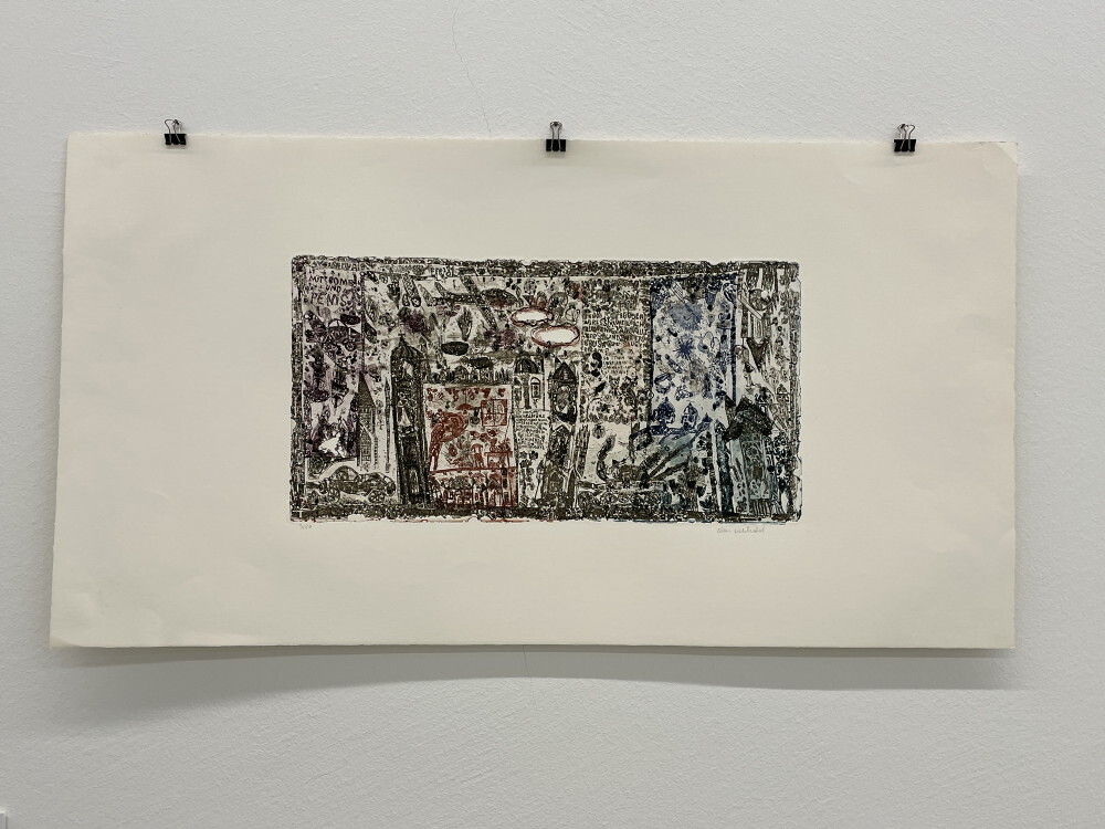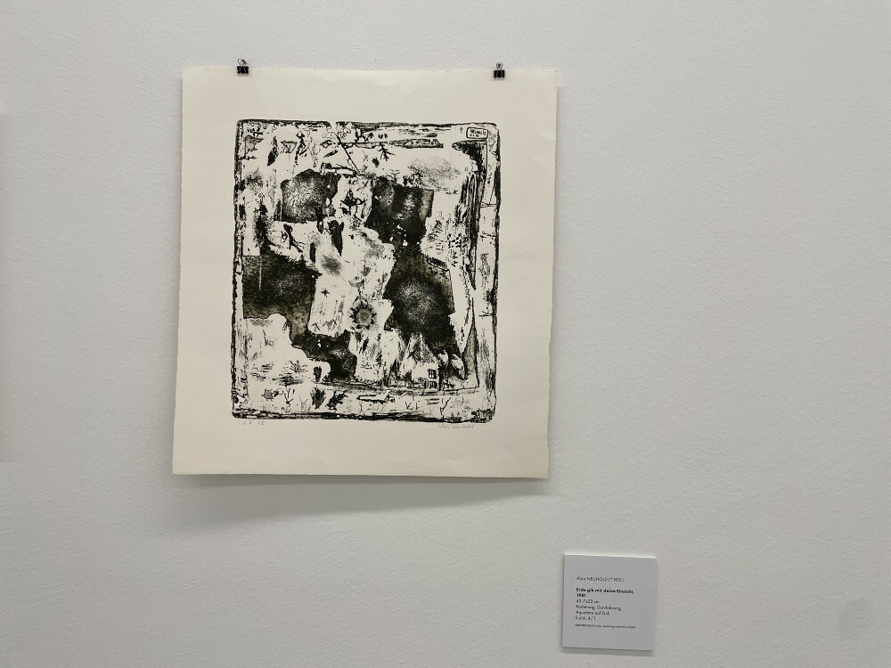Der Opferstein in der Grafik von Hannes Schwarz und das Triptychon von Hannes Priesch sind in einem Raumdreieck mit einem „goldenen Grenzstein“ von Alfredo Barsuglia verbunden, über den eine Lampe wacht … Die Grenze, um an den Anfang zurückzukehren, wo es darum ging, an die „Steiermark“ und ihre Kunst zu erinnern, hat dieses Land in ihrer historischen DNA. Aber wer will die Religionskriege des 16. und 17. Jahrhunderts wieder, wer will auch dieses Abseits wieder, in das die Steiermark in der Zeit des Eisernen Vorhangs verfallen war? Geht es nicht darum – und die Kunst hilft uns wie kein anderes Medium dabei – die Grenzen unserer Vorstellung, der Abschottung und vor allem der Angst zu öffnen? Ich weiß schon: Derzeit sind solche Visionen nicht en vogue. Wir sichern die Grenzen. Wir rüsten auf. Wohin das führt? An Wolfgang Becksteiners Titel der Bomben in der Mitte des Raums sei noch einmal erinnert. In einer der beiden frühen Druckgrafiken von Alois Neuhold aus dem Jahre 1981, die ganz in der Nähe hier positioniert ist und die man besser mit der Lupe anschauen sollte, ist zu lesen: „Mit Bomben und Penis“. Es ist ein Bombengroßangriff darauf radiert, mit Flugzeugen, Bomben, Autos, eine Art Stadt wird groß gezeigt, mit einem Innenleben, aber auch mit Häusern, Kirchtürme und einer Kuppel. Einmal ist zu entziffern: „DURCH GEFÜHLE IST NOCH NIEMAND UMGEKOMMEN, DOCH DIE UNTERDRÜCKUNG DIESER HABEN EIN RIESIGES SCHLACHTFELD HINTERLASSEN.“