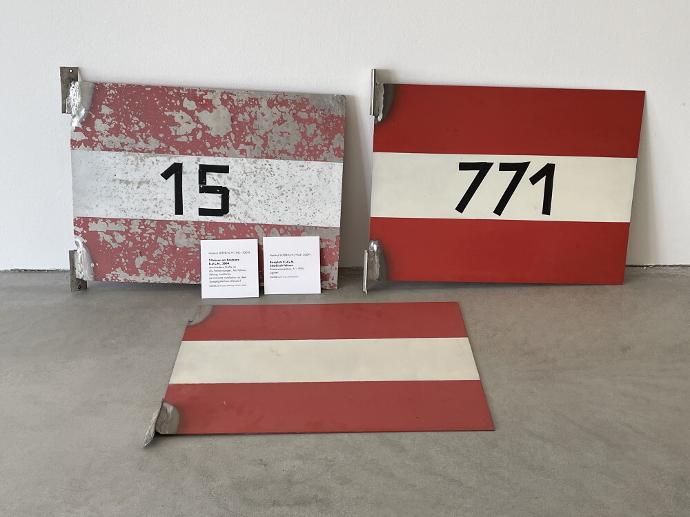 Hartmut Skerbisch, der 2009 viel zu früh verstorben ist, ein Mastermind auch für das über Jahrzehnte dauernde Projekt K.U.L.M. von Richard Frankenberger und seinen Mitstreiter*innen, hat es im Jahr 2004 für den Rastplatz K.U.L.M. geschaffen. Die Originale – eines von ihnen ist durch Wind und Hagel besonders mitgenommen – liegen in der Ausstellung unter einer kleinen Briefmarkenedition dieser Installation mit je 55 Cent.