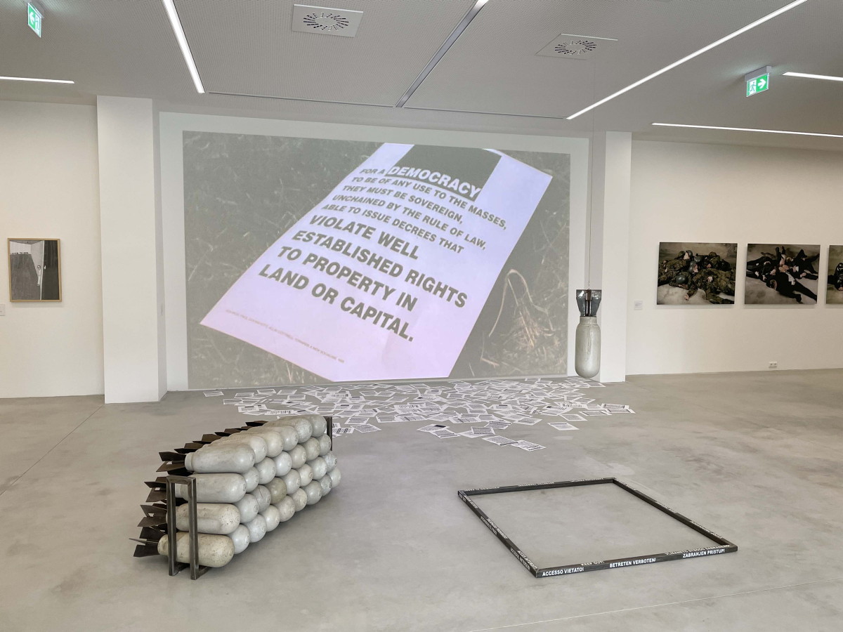 Vielleicht fällt uns dabei eines ein: Die Unterscheidung von „liberal“ und „illiberal“ ist ein Anzeichen, dass etwas am Demokratiebegriff zu wackeln beginnt: Hätten wir zu der Zeit, als die Fahnen Skerbischs entstanden sind, je nur daran gedacht, dass die erstere nicht mehr selbstverständlich sein würde – selbst bei uns? (Wenn man auf die Entstehungszeit von „FLY DEMOCRACY“ sieht, ist auch ihre Erstaufführung nicht viel später passiert.) Demokratie, das Wort das vor allem die Amerikaner der ganzen Welt bringen wollten, indem sie, bevor sie Länder aus geostrategischen Überlegungen oder zur besseren Kontrolle der Erdölvorkommen angriffen, Zettel mit Botschaften an die Bevölkerung abwarfen, die Demokratie versprachen: im Irak, in Afghanistan. (Doch dort herrschen mittlerweile – d.h. 15 Jahre später – die Taliban. Frauen werden ihrer Rechte entraubt, sie dürfen nicht mehr auf die Universität, selbst Bildung wird ihnen mehr und mehr verboten.) Ein zentrales Werk dieser Ausstellung ist dies: Ein Zettelregen zur Demokratieanleitung von Oliver Ressler, sowohl als Video als auch in Form ganz realer Flugblätter. Doch der hier gezeigte „Abwurf“ geschieht symbolisch in den USA selbst, 13 Jahre vor dem Angriff der Trump-Anhänger auf das Kapitol, wohlgemerkt. Hier geht es um direkte und partizipative Demokratieformen – und diese stehen damit natürlich „in einem inhaltlichen Widerspruch zu dem von der US-Regierung forcierten Modell der formalen Demokratie, die in einem neoliberalen kapitalistischen Staat eingebettet ist“ (O.R.)