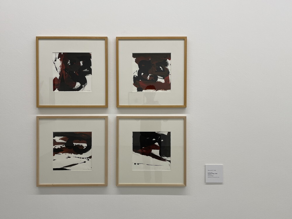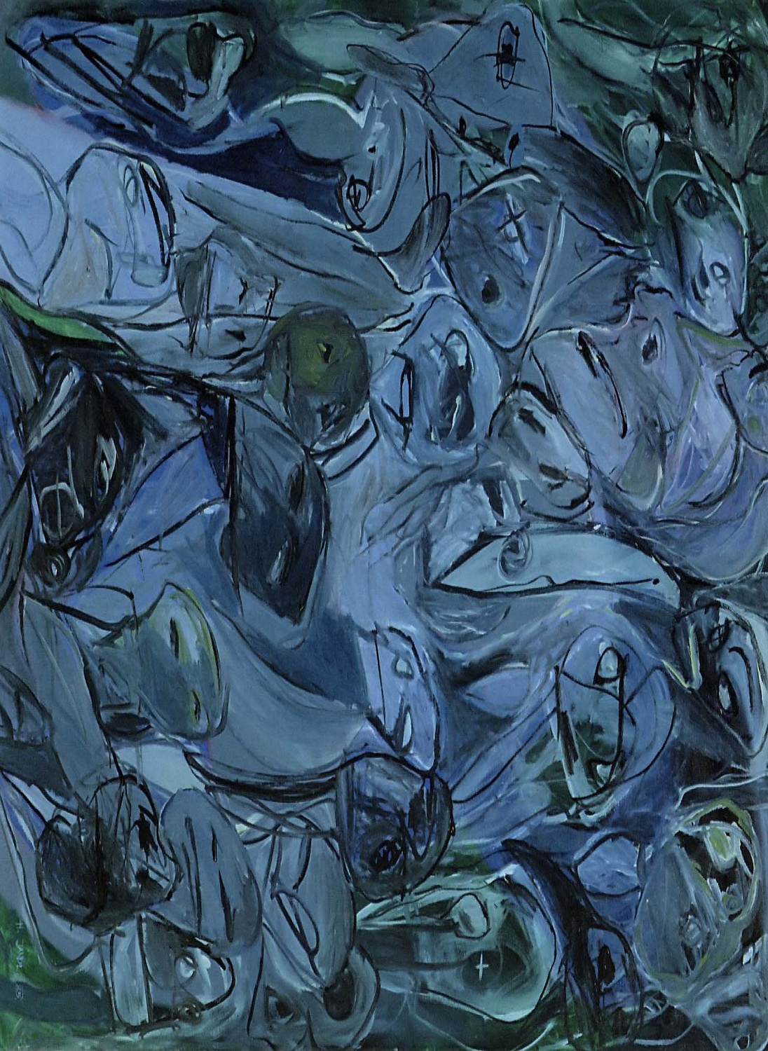 Auch das neben diesem Bild hängende Gemälde „Massenangst“, ein frühes Bild von Hans Jandl, lässt ein flirrendes Geistergefühl aus blauen, amöbenartigen Körpern hochkommen, denen ein kollektiver Schrei eingeschrieben ist – eine Szene purer Panik nicht nur um das eigene Überleben, sondern um mehr: Es ist ein dramatisches Unbehagen ins Bild gesetzt, die so von der Panik Erfassten, wollen keineswegs im Bild verbleiben. Die Schwere des giftigen Bleis ist vielleicht später als charakteristisches Formelement in Jandls Bildern geblieben, nur finden sie einen ganz anderen gestalterischen Ausdruck.
