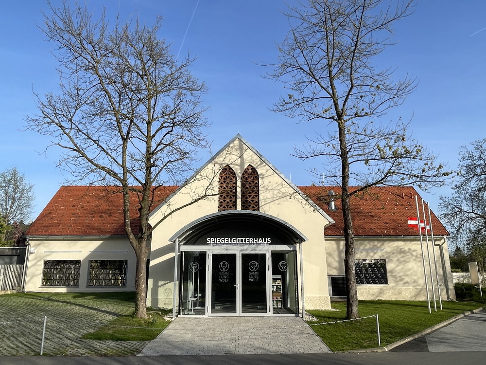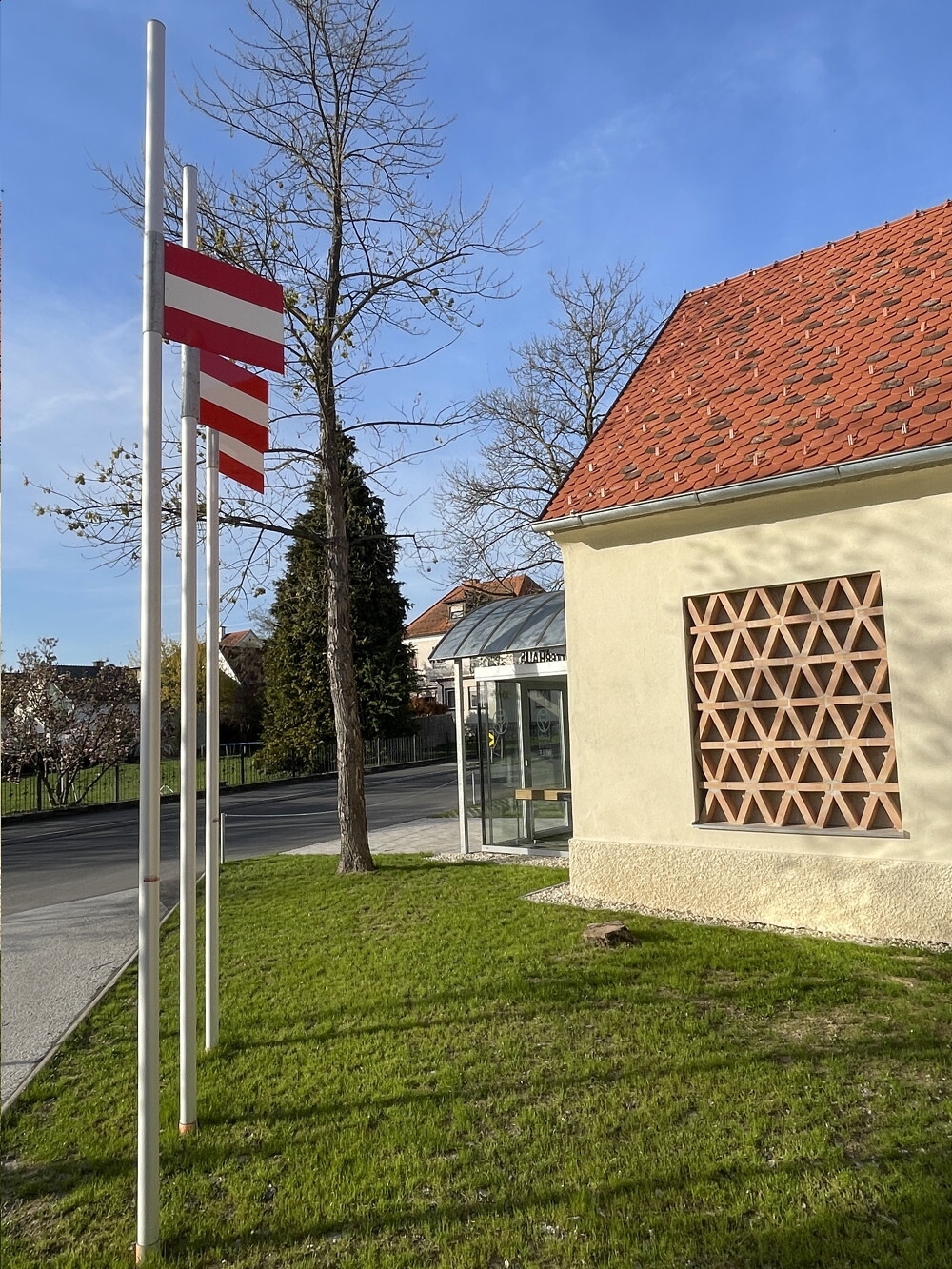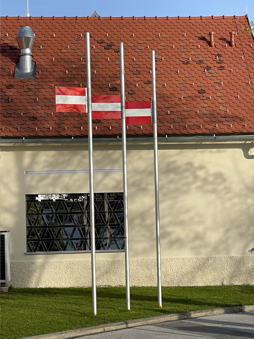 Die Fahnen der Demokratie aber sind auf Halbmast gesetzt: Drei österreichische Fahnen sind rechts vom Eingang dieses „Spiegelgitterhauses“, das von Erich Wolf auf so vorbildliche Weise als oststeirische Lokalarchitektur saniert wurde, auf drei Fahnenstangen montiert, sie wehen nicht, sie sind erstarrt – auf Halbmast wohlgemerkt. Warum, o felix Austria, sind deine Fahnen auf Halbmast? Eine mögliche Antwort aus dem Frühjahr 2024: Weil du ein Land der Spione für Russland bist? Ich möchte die Antwort nach den EU-Wahlen, aber auch die Antworten vom Herbst des Jahres 2024 nicht erst ahnen.