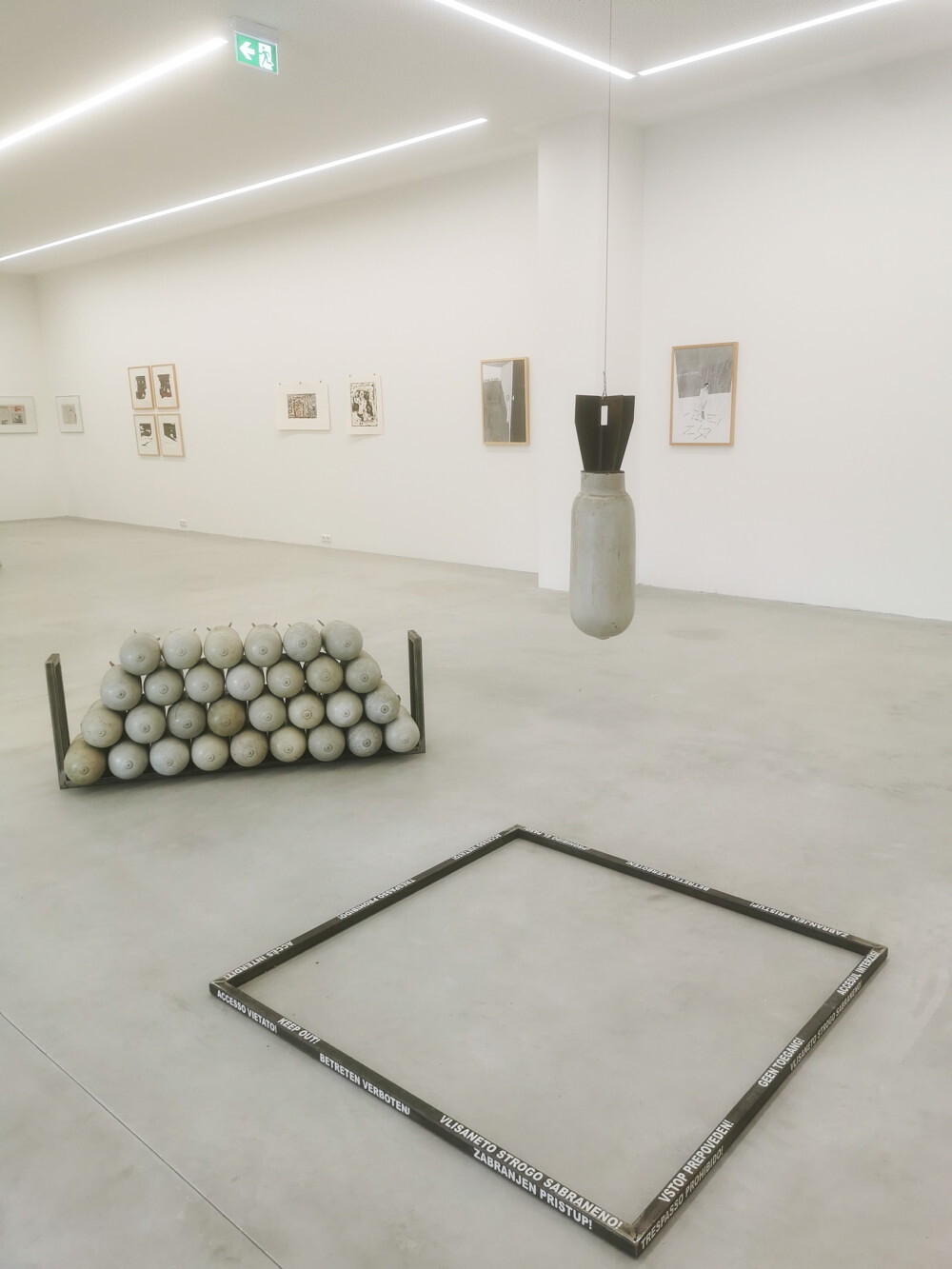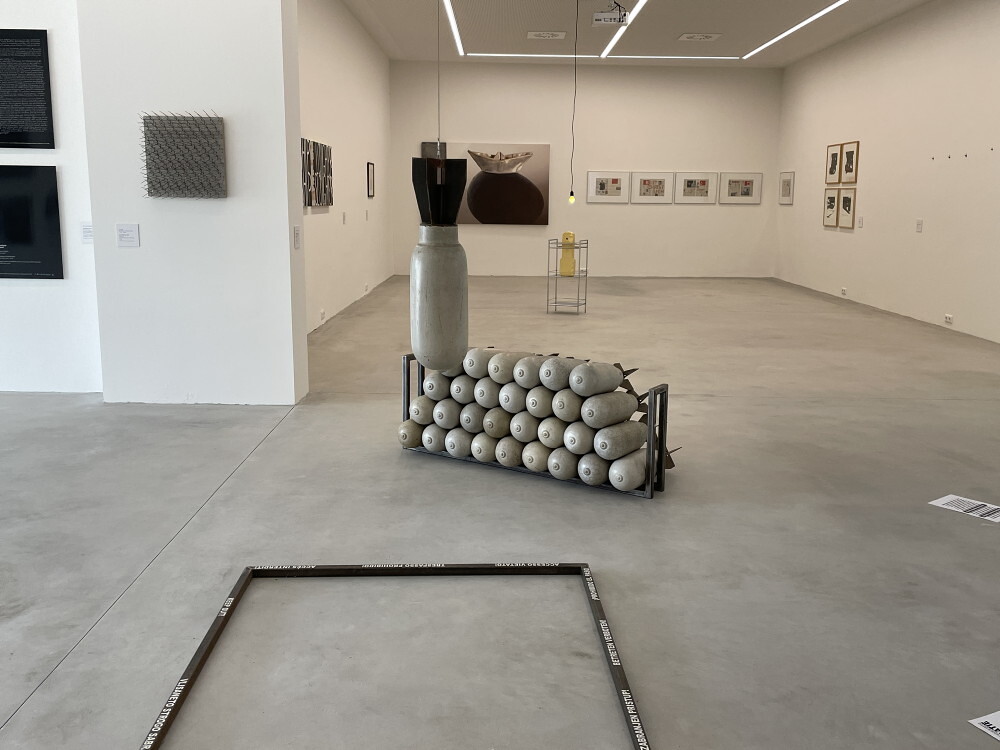 Das eindringlichste „Bild“ in dieser Ausstellung ist die hängende Betonbombe der Marke „Becksteiner“ – ja, Waffen herzustellen ist vor allem auch ein Geschäft –; ihr ist 30-facher Vorrat an „Becksteiner-Bomben“ beigegeben. 30 steht freilich nur symbolisch, ebenso die Marke, nicht aber das Material: Wolfgang Becksteiners Bomben sind nicht echt, der Zahn der Grausamkeit ist ihnen dennoch nicht genommen: Sie sind keine „Schwedenbomben“. Sie werden, weil aus Beton, nicht explodieren; doch Kunst ist dazu da, Imaginationen zu entfachen. Selbsterklärend ist dabei der Werktitel. „Während eine Bombe für unermesslichen Lärm sorgt, schaffen 30 weitere große Stille.“