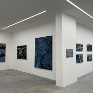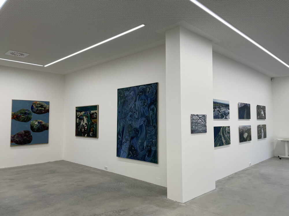 Im Arrangement der Eröffnungsausstellung im rechten Flügel des Spiegelgitterhauses werden die Köpfe kuratorisch auch einer Inszenierung unterzogen: Jene in den Bildern von Oliver Ressler und von G.R.A.M. aber auch jenen diesen folgenden Bildern von Wolfgang Wiedner, Friedrich Aduatz und Hans Jandl. Besonders ästhetisch überzeugend sind die Köpfe von Wiedner, wie sie so farbenprächtig aus dem Hellblau des Hintergrunds ragen. Wiedner, Vertreter der „Jungen Wilden“ aus der gleichen Generation wie Neuhold und Jandl, lässt das Malerische hochleben, ohne sich auf symbolische Bedeutungen festnageln zu lassen. Doch auch wenn dieses Bild uns noch so malerisch überzeugt kann man sich der Situation nicht entziehen, in der man als Betrachterin oder Betrachter dieses Settings ansichtig wird: Man liegt am Boden, wenn man diese Köpfe sehen sollte, die auf einen herabblicken.