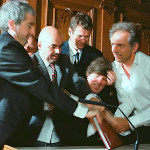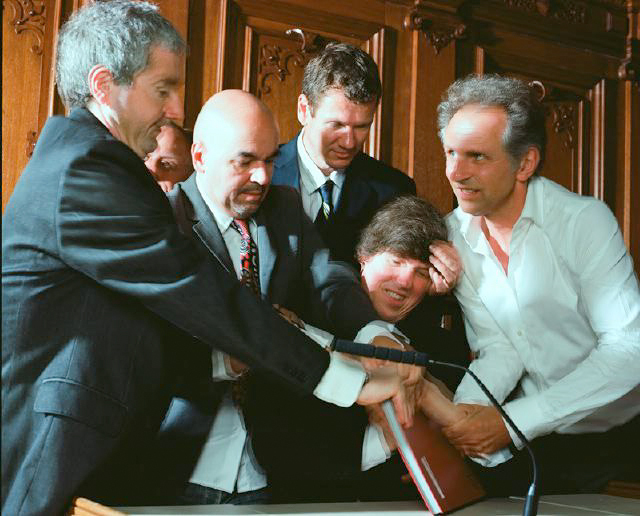 Wo in unmittelbarer Nähe die schlafenden – oder in den Schlaf versetzten – Polizisten, Soldaten und Manager von Oliver Ressler ihre Köpfe zusammenstecken, sind es beim angrenzenden Foto „Hohes Haus, Kiew“, (2010) von G.R.A.M. die Politiker, die in den Parlamenten handgreiflich werden und so aneinandergeraten. (Meist männliche) Schlägereien in Parlamenten – das gibt es immer wieder und bis heute. Es wird in dieser Serie nicht die Geschichte der Revolution in der Ukraine erzählt, der Künstlergruppe interessierten vielmehr die Fotos dieser Handgreiflichkeiten in Volksvertretungen weltweit, aus denen sie zehn Motive ausgewählt hat und als Reenactment im Grazer Gemeinderatssitzungssaal nachgestellt hat: „Zu sehen sind Menschengruppen in erstarrten Haltungen, wobei Abgeordnete gewürgt und gestoßen, geschoben, gerempelt oder Ähnliches werden. In einigen Szenerien erinnern die Abbilder der übersteigerten Leidenschaft an (barocke) Gemälde mit religiösen Motiven: Hell-Dunkel-Szenerien, gepaart mit manierierten Posen, pathetischen Armhaltungen, fratzenhaften Antlitzen oder dynamischen Körperverwicklungen.“ (G.R.A.M., „Hohes Haus“, Christine König Galerie, 2011)