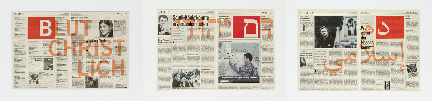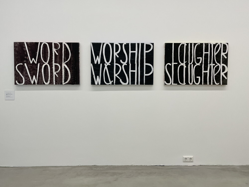 WORD/SWORD, LAUGHTER/SLAUGHTER, WORSHIP/WARSHIP. Also übersetzt: WORT/SCHWERT, GELÄCHTER/GEMETZEL, SORGE/KRIEG. Es sind nur kleine Buchstabenveränderungen, die Verheerendes auslösen können, auch und gerade im Namen Gottes. Eben hat Hannes Priesch den vierten Band seiner auf sieben Bände angelegten Werkausgabe herausgegeben, der das Thema Religion bespielt. Auch dieses hier gezeigte dreiteilige Werk – es ist eines der ersten Abgebildeten in seinem neuen Buch „IN HOC SIGNO VINCE“ (PRIESCH WÖRKS 4) – war in einer Ausstellung des KULTUM im Priesterseminar (in Kooperation mit dem steirischen herbst 2007) das erste (und seither das letzte) Mal ausgestellt. Wolf hat es damals erworben. Nun habe ich es wieder ausgepackt.