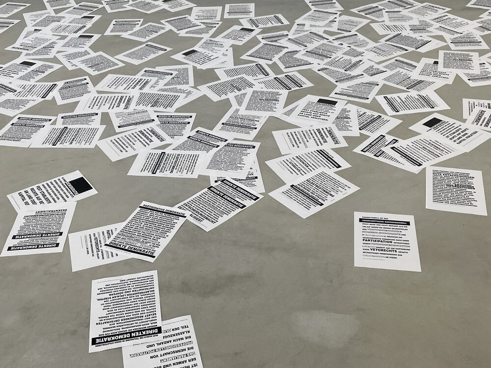 Demokratie! Wohin bist du nur gekommen! Demokratie! Dieses griechische Wort, von dem wir doch glaubten, es sei die einzig wirklich gerechte und richtige Staatsform zum Wohl der Menschheit. Meint Demokratie nicht Herrschaft des Volkes? Was aber ist der Demos, das Volk? Die medienhörige Masse? Die Armen? Eine politische Klasse, hörig den sie einflüsternden Lobbyisten? Wenn man die Zettel, die hier am Boden liegen, nur ein wenig liest, wird man hellhörig für diese Fragen und beginnt, ihre Repräsentanten sehr kritisch zu beäugen. Jede Ausstellungsbesucherin, jeder Ausstellungsbesucher kann einen Zettel mitnehmen.