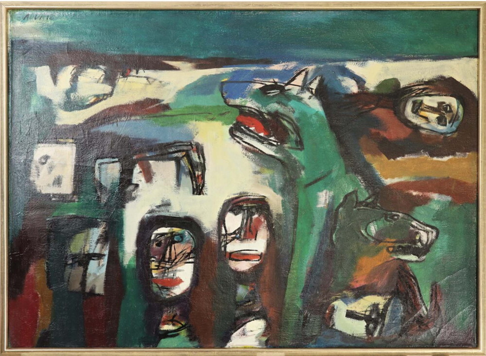 Die Bedrohung ist auch gerade am Schönen nicht zu unterschätzen. Dass Menschenköpfe und seltsame Tierköpfe im angrenzenden Bild von Friedrich Aduatz, diesem bedeutenden Vertreter moderner Malerei auf dem Weg zur Abstraktion in der Steiermark, der sich schon damals um internationale Entwicklungen kümmerte – der 1907 in Pula (Istrien) geborene und 1994 in Voitsberg verstorbene Künstler ist der „älteste“ Künstler dieser Schau – den Titel „Das Massaker“ trägt, grenzt hier ans Mythische. Wer frisst wen in dieser Situation der Angst der hier so Dargestellten?