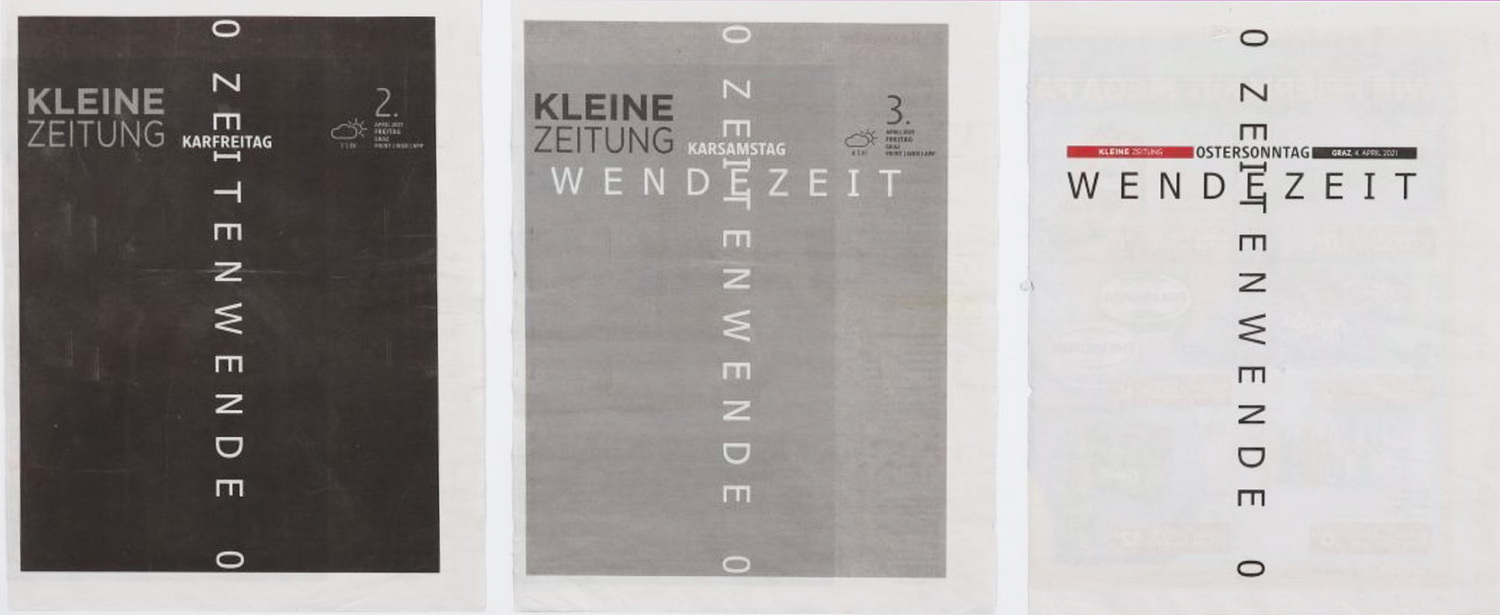 Richard KRIESCHE: WENDEZEIT/ZEITENWENDE. Karfreitag/Karsamstag/Ostersonntag, Medienkunst für die Kleine Zeitung, 2021, je 30x23 cm, gesamt 30x72 cm