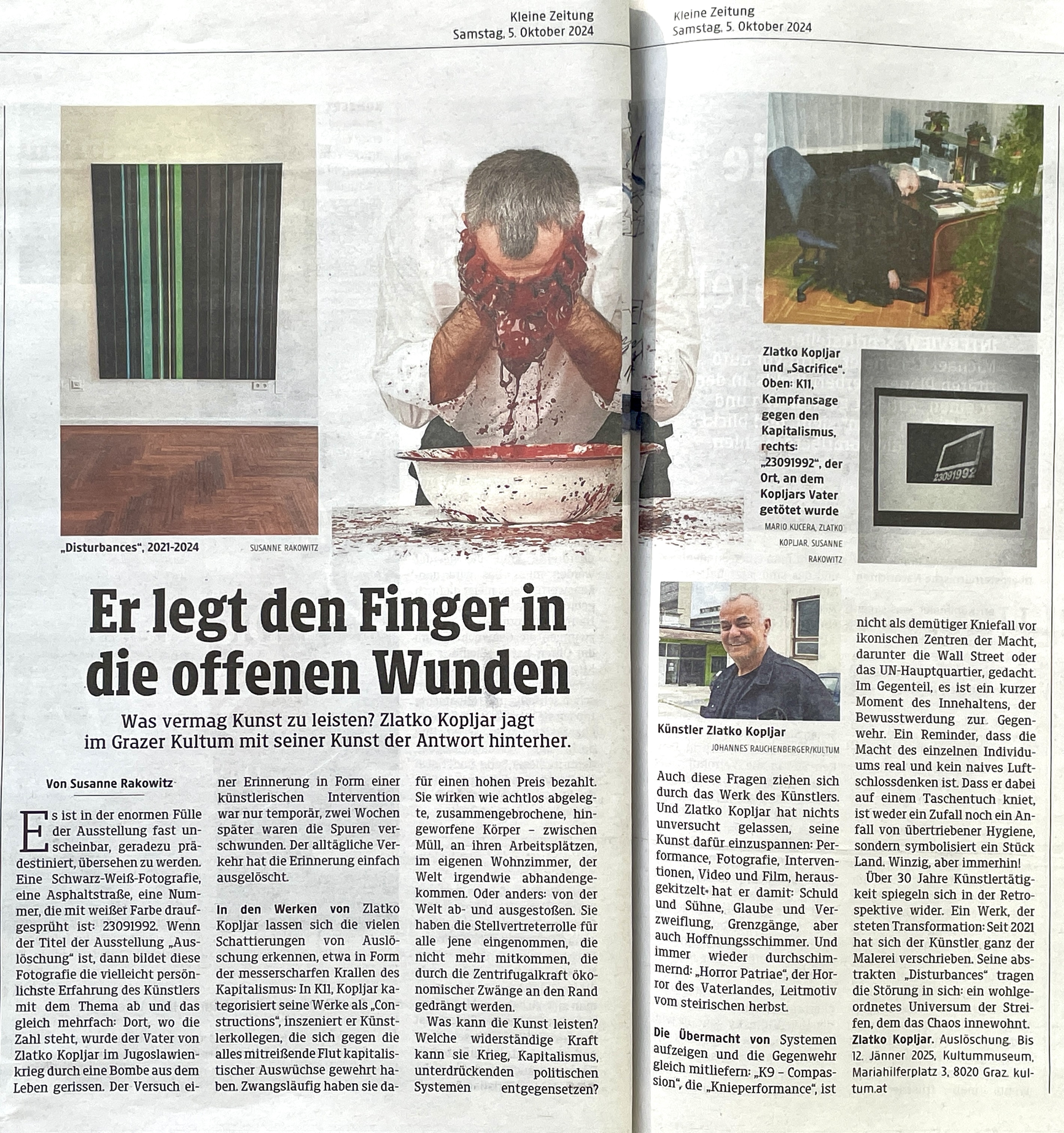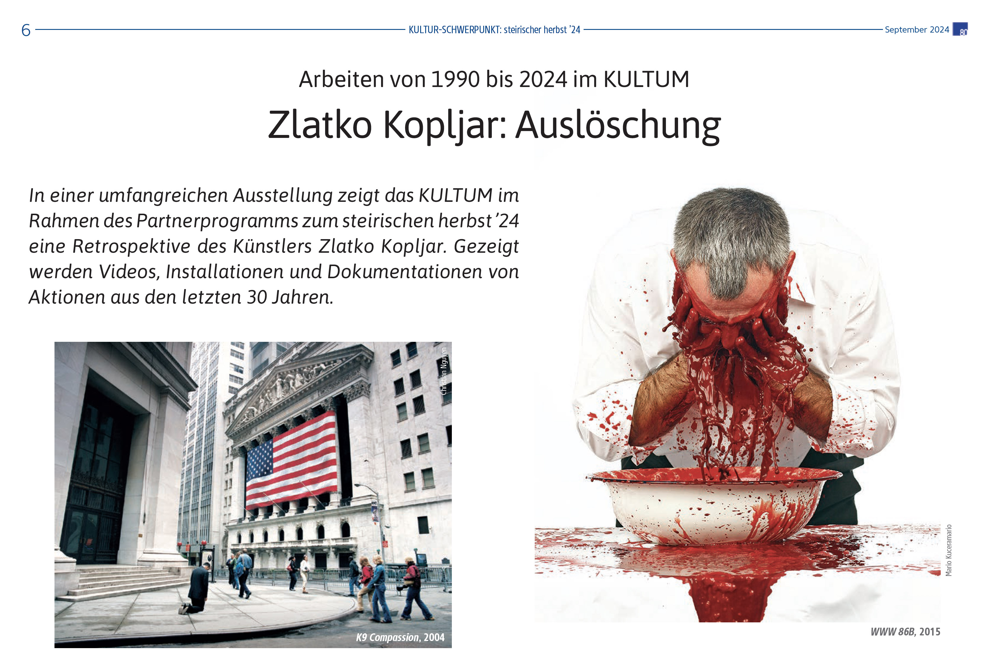 At a time of deeply felt crises and new wars, the work of Croatian artist Zlatko Kopljar is an artistic example of an ethical and aesthetic (re)orientation: Kopljar explores the lasting after-effects of the traumas of the 20th century for the present day and subjects them to artistic transformation. In co-production with steirischer herbst ‘24, the KULTUMUSEUM Graz is showing a retrospective of the artist's work spanning a period of 30 years.