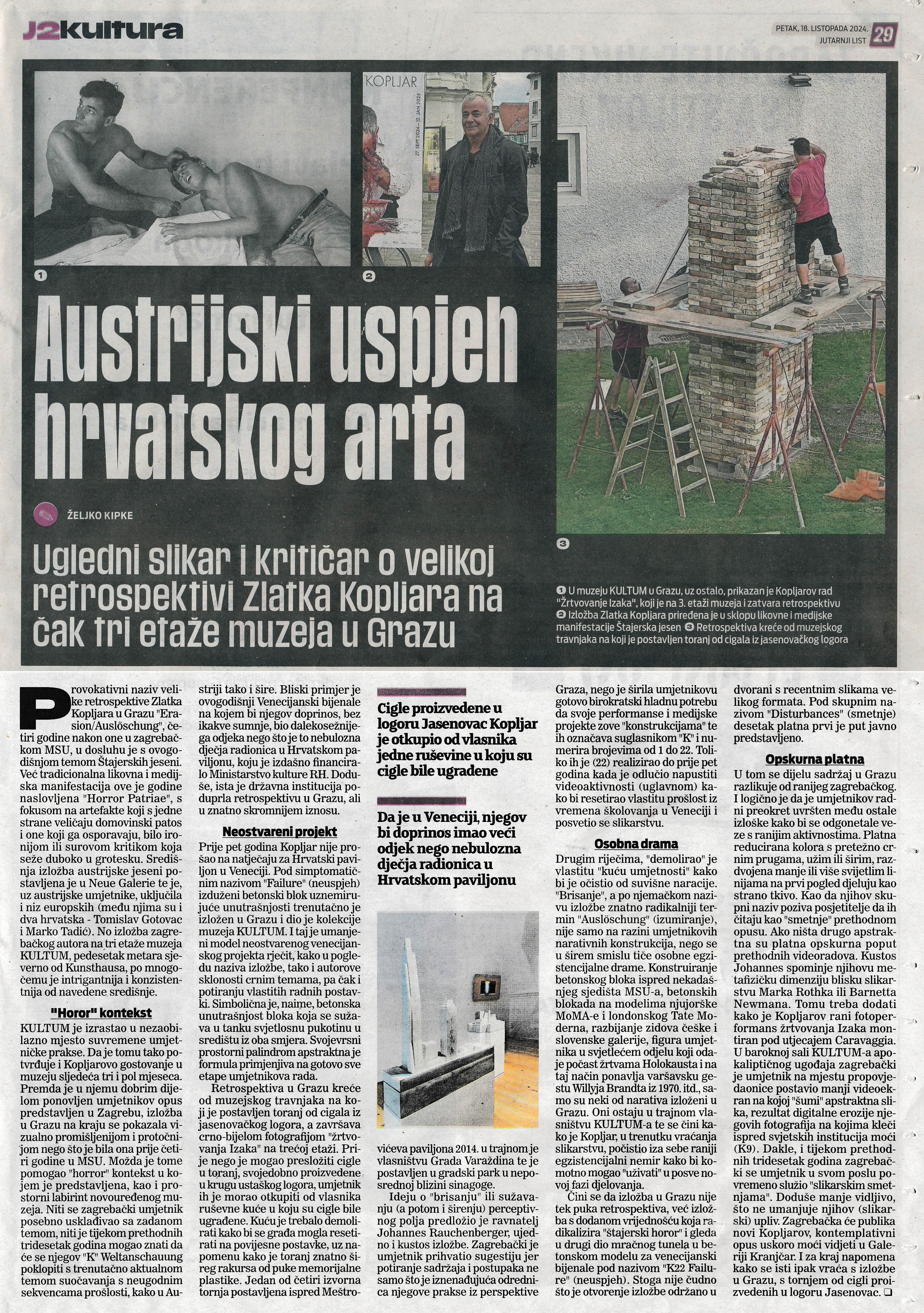 The presentation of almost the entire artistic oeuvre of Zlatko Kopljar in Graz took place in the partner program of steirischer herbst 24 with his theme “HORROR PATRIAE”, in a political election year that has seen the threatening rise of populist, in some cases far-right parties both locally and internationally. Kopljar is constantly revisiting his personal “Horror Patriae” in a wide variety of media, which is also a general and topical issue—not just for Austria, but for Europe as a whole.