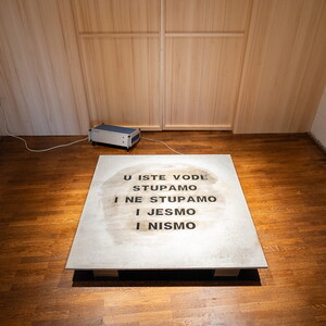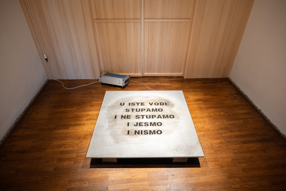 U ISTE VODE STUPAMO I NE STUPAMO I JESMO I NISMO heißt übersetzt: „Wir steigen nicht zweimal in denselben Fluss“. Das Arrangement aus Gusseisen, Glas und Motoröl ist an einem Starkstromgerät angeschlossen: Auf diese Fläche, in dieses Wasser zu steigen, bedeutet Lebensgefahr. Kopljars Aktivierung des berühmten Heraklit-Zitats wird hier als lebensbedrohende Gefahrenzone ausgewiesen. Der überzeitliche Appell aus dieser Installation: Was aber ist zu tun, wenn wir spüren, dass sich die Geschichte dennoch zu wiederholen beginnt?