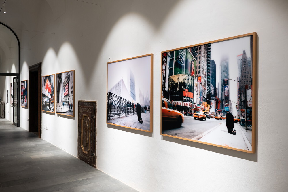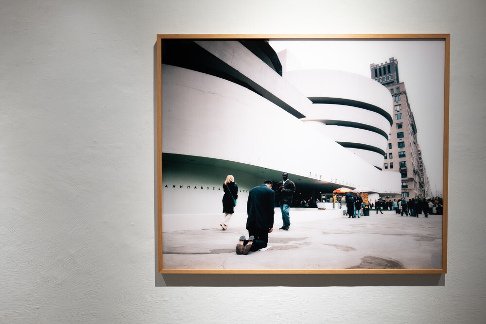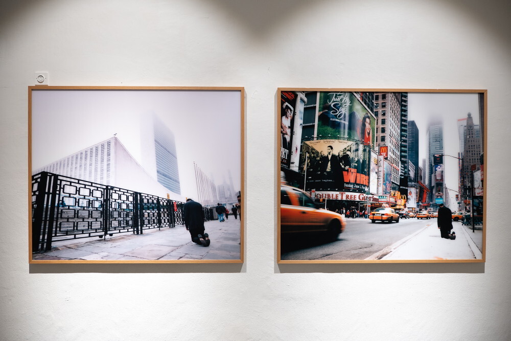 K9 compassion, die „Knieperformance“ in New York und anderen Zentren der Macht, für die Kopljar international bekannt geworden ist, ist im Südflügel hin zum Minoritensaal aufgereiht. Der Künstler kniet dabei auf einem Taschentuch, dem einzigen Stück Land, das er dabei hat.
