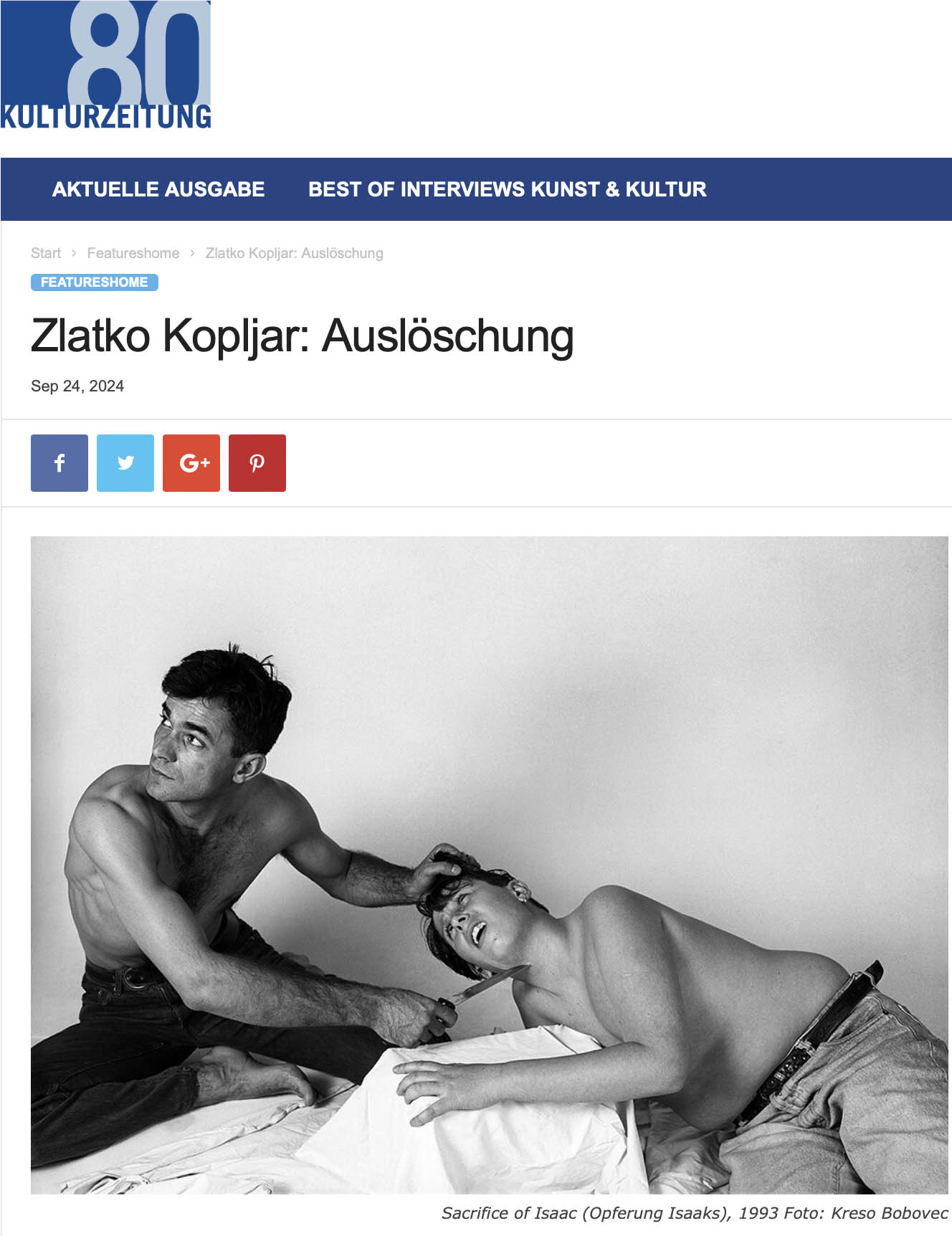Unmittelbar nach der Vollendung seines Studium begann der Krieg in Kroatien: Zlatko Kopljar erinnert in der frühen Arbeit Sacrifice of Isaac dabei verstörend an das Opfer Abrahams (Gen 22). Religionsgeschichtlich wird die in Genesis 22 geschilderte Szene als das Ende der Menschenopfer für die Gottheit angesehen. Aber ist es dabei geblieben? Warum hat Gott heute – beim Morden und Opfern der eigenen „Söhne“ – nicht eingegriffen wie einst in der Bibel? In Zlatko Kopljars Abrahamsopfer-Bearbeitung geht es schlicht um den Mut, offensichtlich sinnlose Opfer, in welchen Namen auch immer sie gefordert werden, nicht zu vollziehen. Kunsthistorisches Vorbild war das Bild Caravaggios in den Uffizien. Doch dort hält ein Engel den Opfernden ab – bei Kopljar ist es nur der Blick nach Außen zum Betrachter. „Ich glaube nicht an Engel“, sagt der Künstler. „Aber ich glaube an den Mut, an die Courage, es nicht zu tun.“
